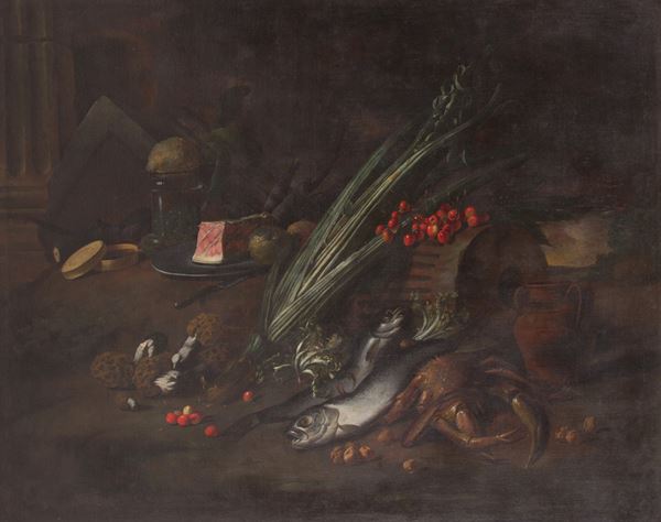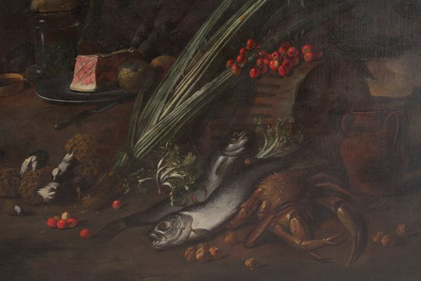 Dipinto "FRUTTI, VERDURE, FUNGHI, DOLCIUMI E FAUNA ITTICA IN UN PAESAGGIO"