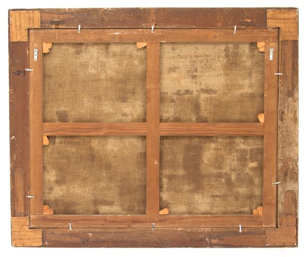 Dipinto olio su tela raffigurante "FRUTTI, VERDURE, FUNGHI, DOLCIUMI E FAUNA ITTICA IN UN PAESAGGIO". In cornice coeva. Vecchio rintelo e rintelaiatura. Restauri. Con perizia del Dr. Gianluca Bocchi.