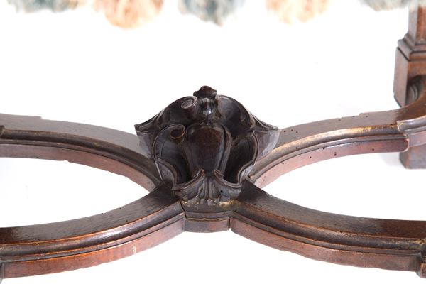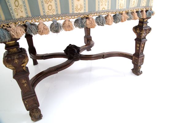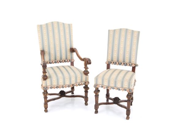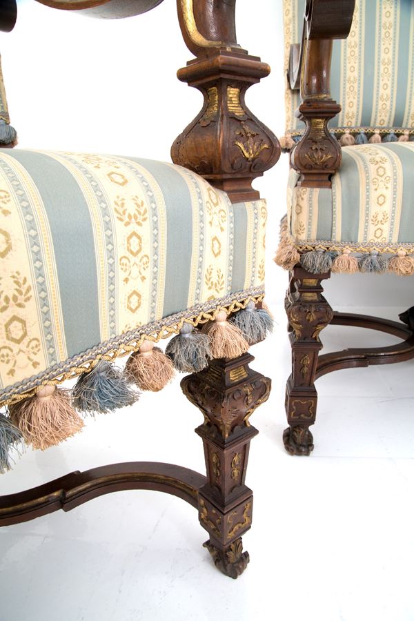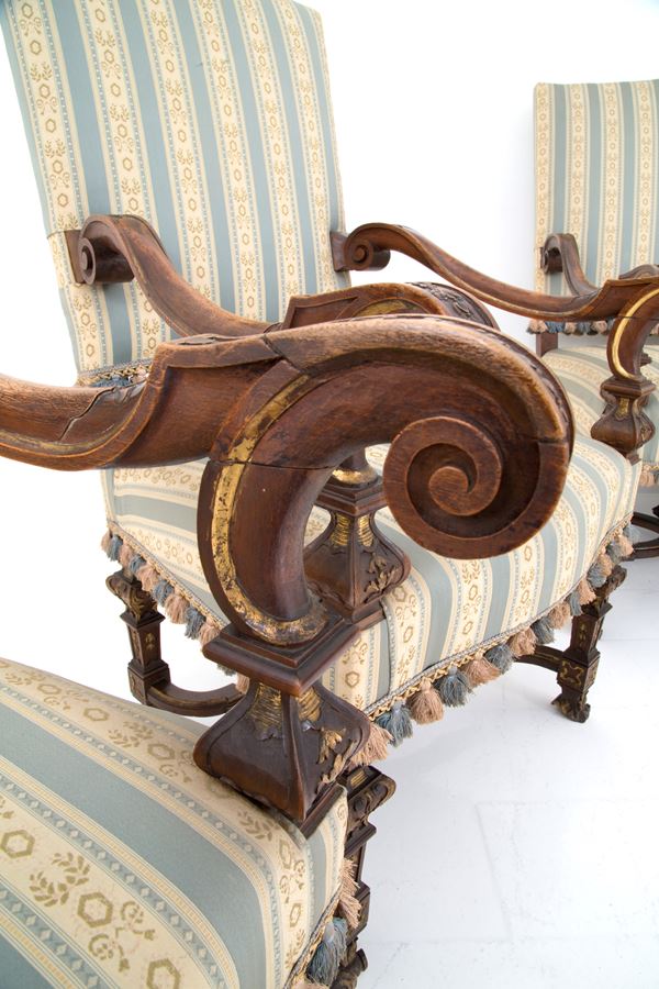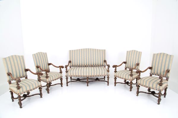 Salotto in noce intagliato e parzialmente dorato con gambe unite da crociera, composto da un divano a tre posti, quattro poltrone e due sedie con schienali e sedute imbottite. XIX secolo. Lievi difetti.