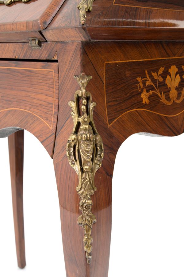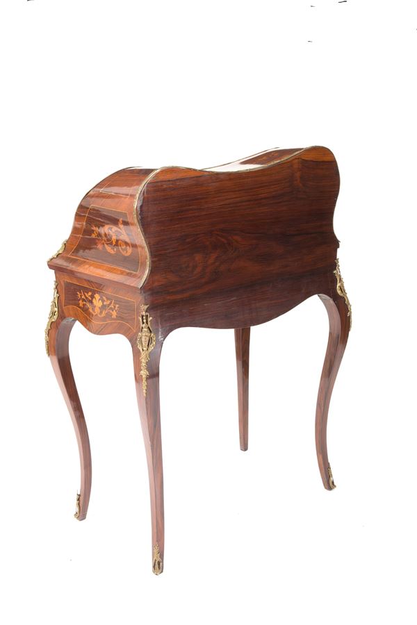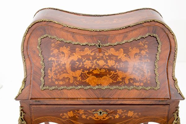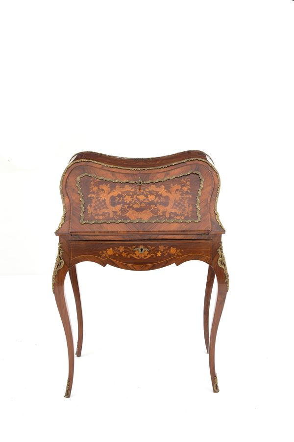 Scrittoio da centro in legni vari con gambe mosse e finiture in bronzo cesellato. XIX secolo.