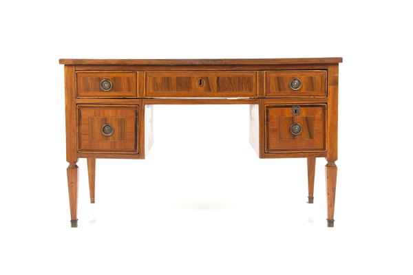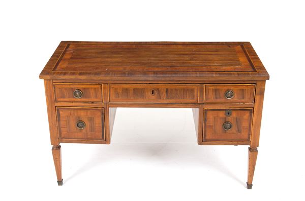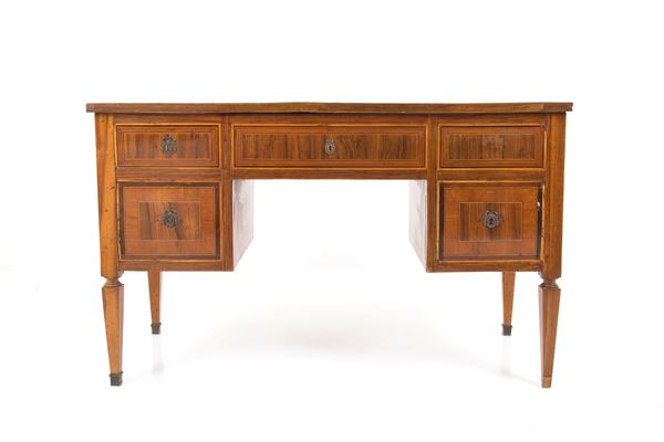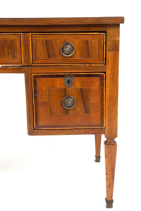 Scrittoio da centro lastronato e filettato in legni vari. Periodo Luigi XVI. Lievi difetti.