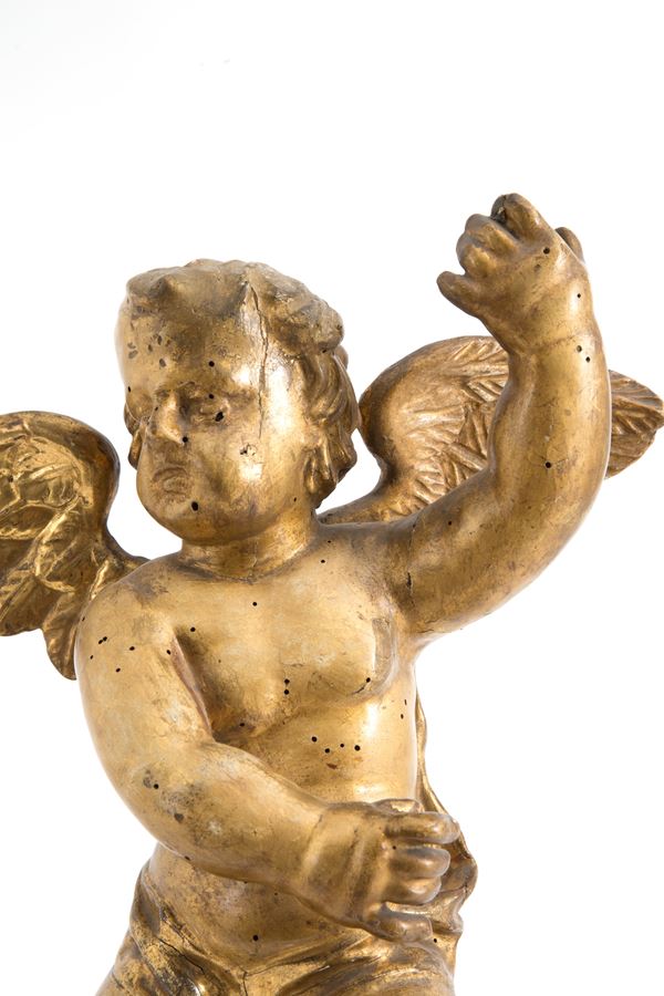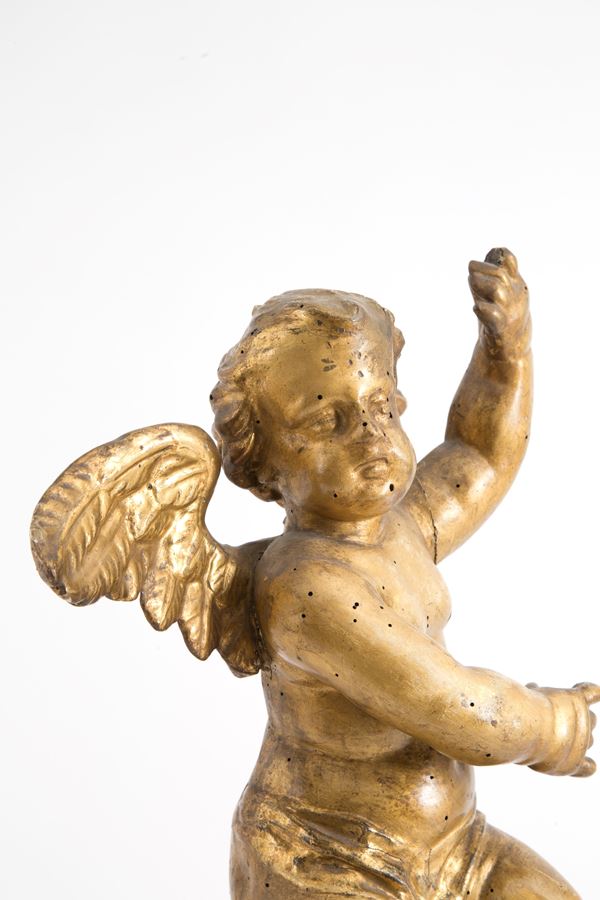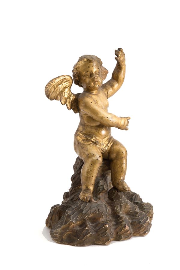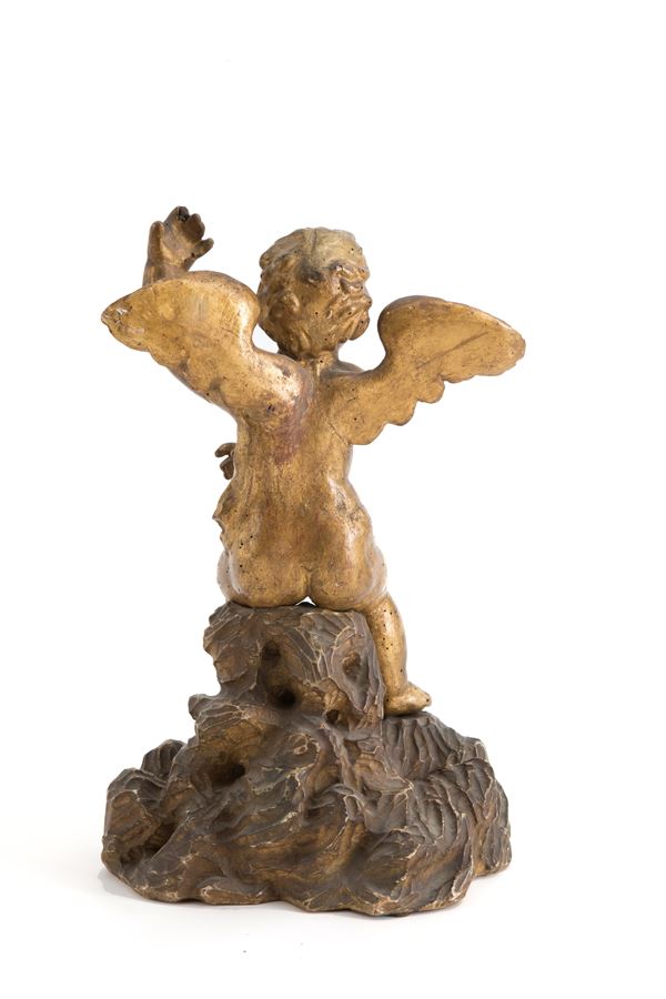 Scultura in legno dorato raffigurante "PUTTO" su base in finta roccia. XVIII secolo. Difetti e mancanze.