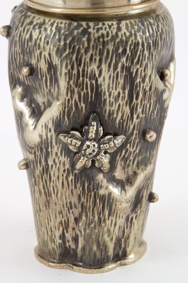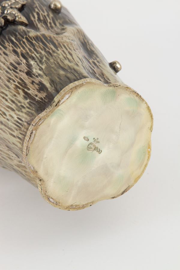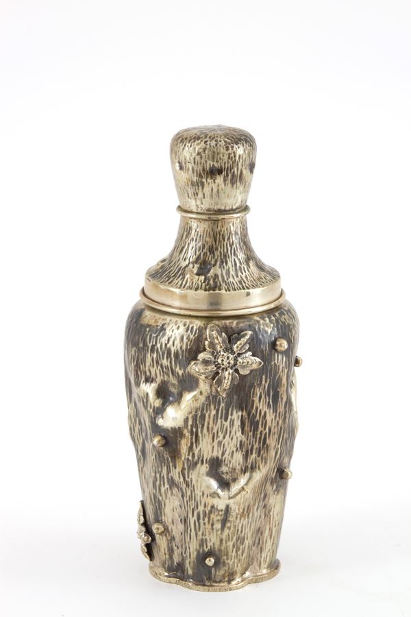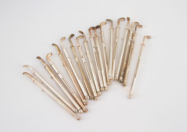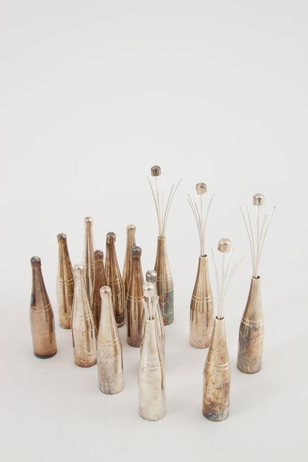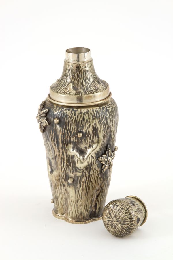 Shaker e miscelatori a forma di mazze da golf e bottiglie in argento 800, gr. 835 ca. complessivi. Punzoni sul fondo dello shaker.