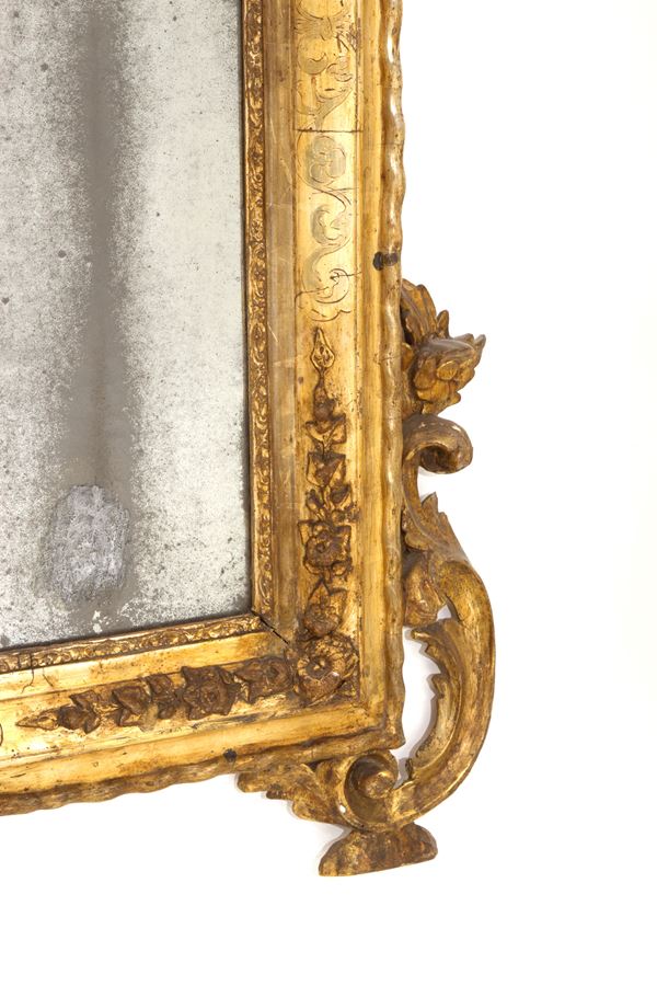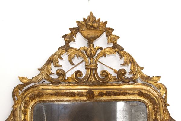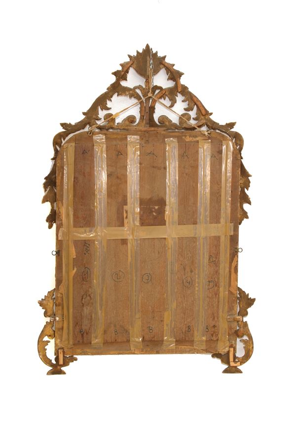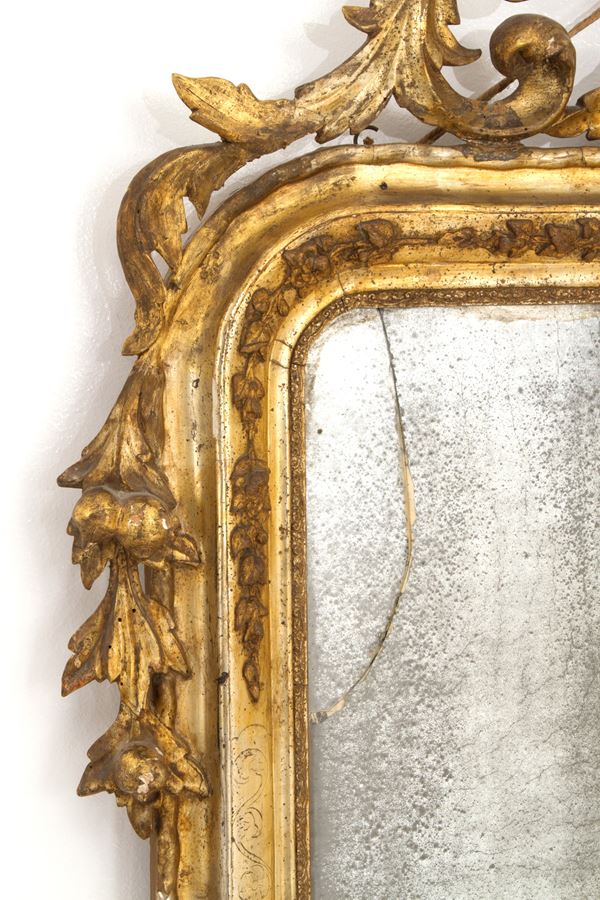 Specchiera in legno intagliato e dorato con cimasa. XIX secolo. Specchio rotto.