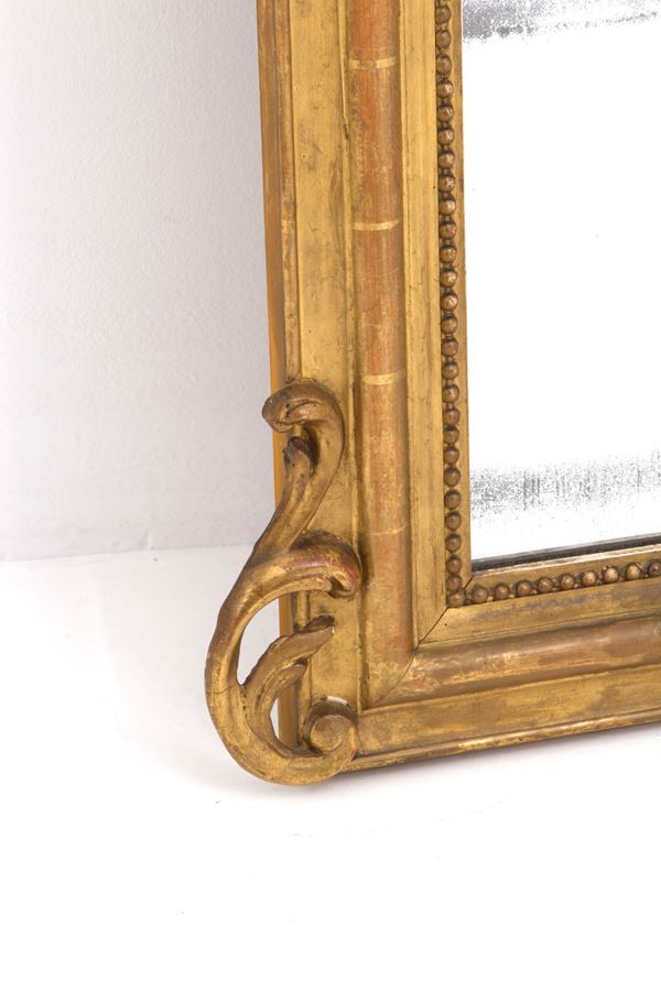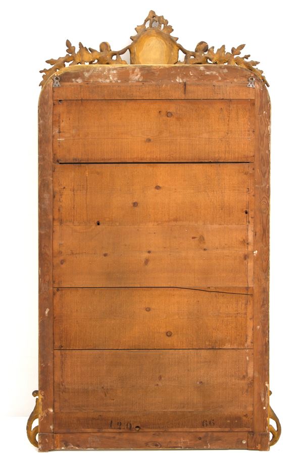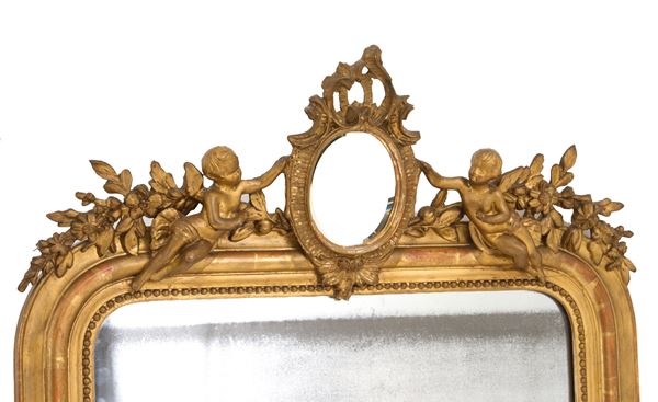 Specchiera in legno intagliato e dorato con cimasa con festoni e putti. XIX secolo. Difetti.