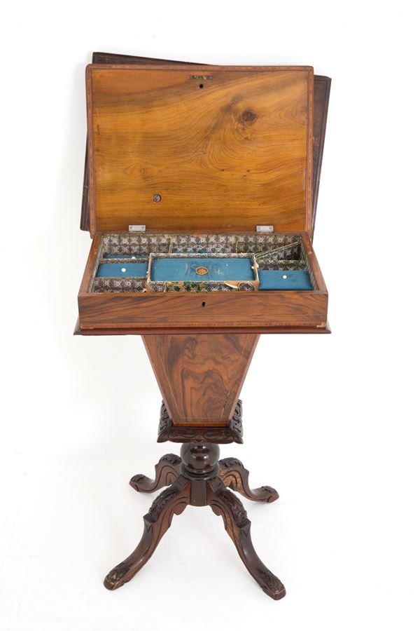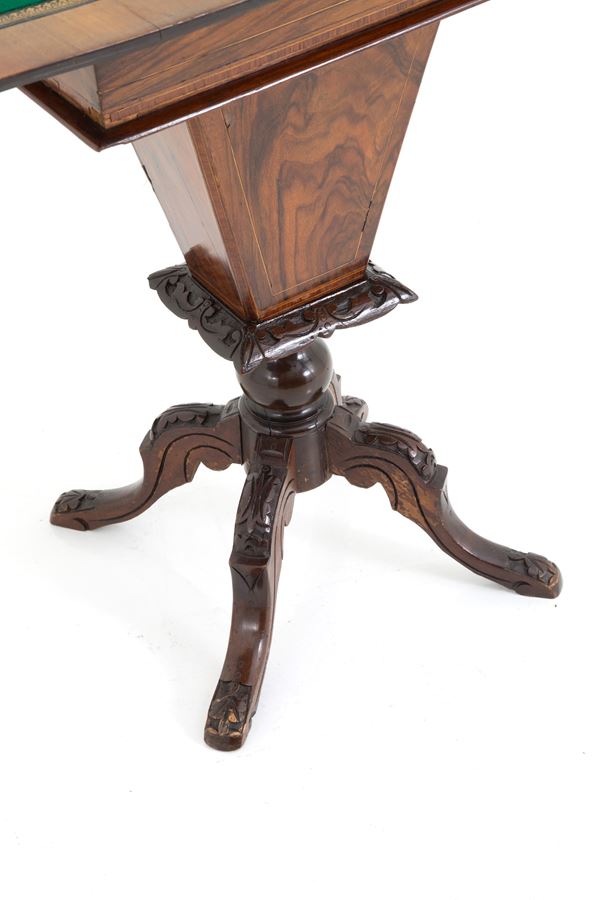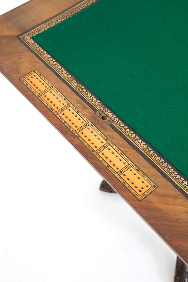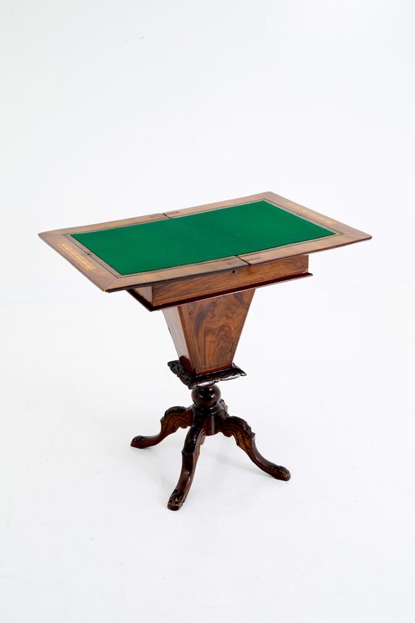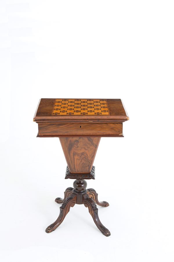Tavolino da gioco lastronato e intarsiato a scacchiera in legni vari. Francia. XIX secolo. Difetti.