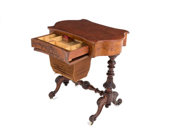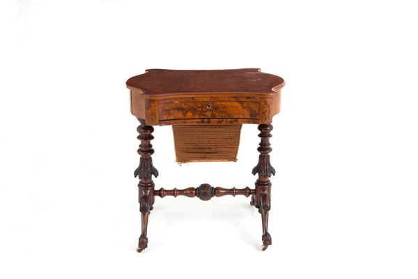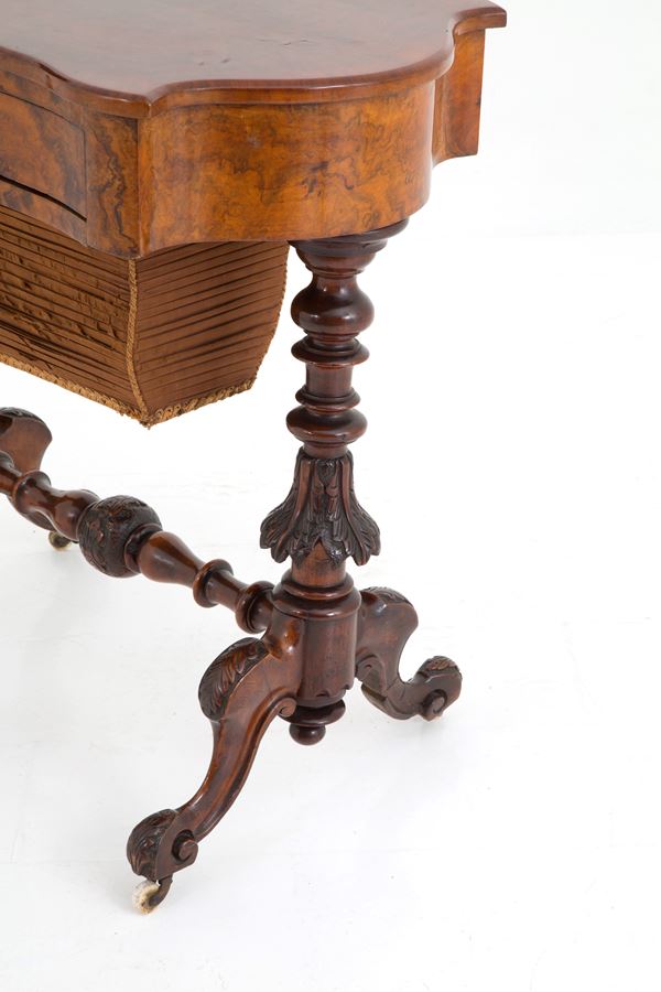 Tavolino da lavoro impiallacciato in radica con sostegni e traversa torniti in mogano. XIX secolo.