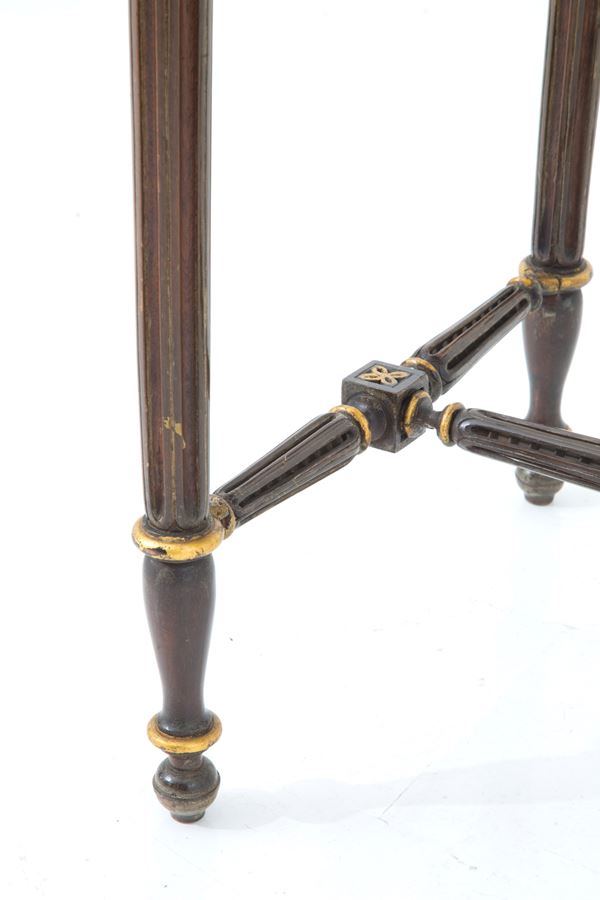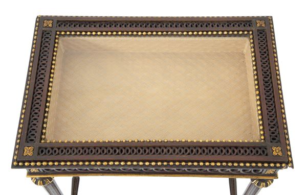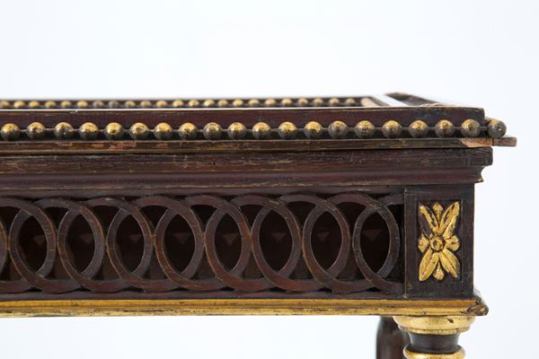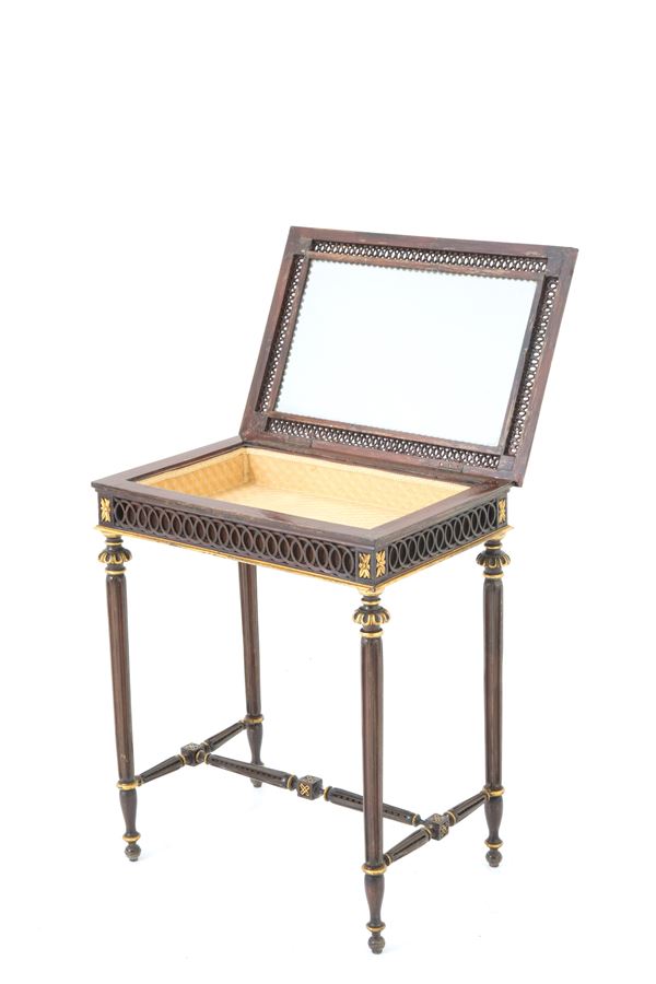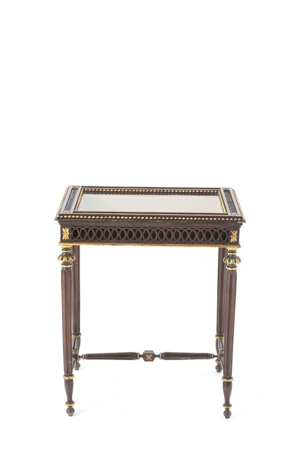 Tavolino-vetrina in mogano intagliato, traforato e parzialmente dorato e gambe scanalate. Fine XIX secolo.