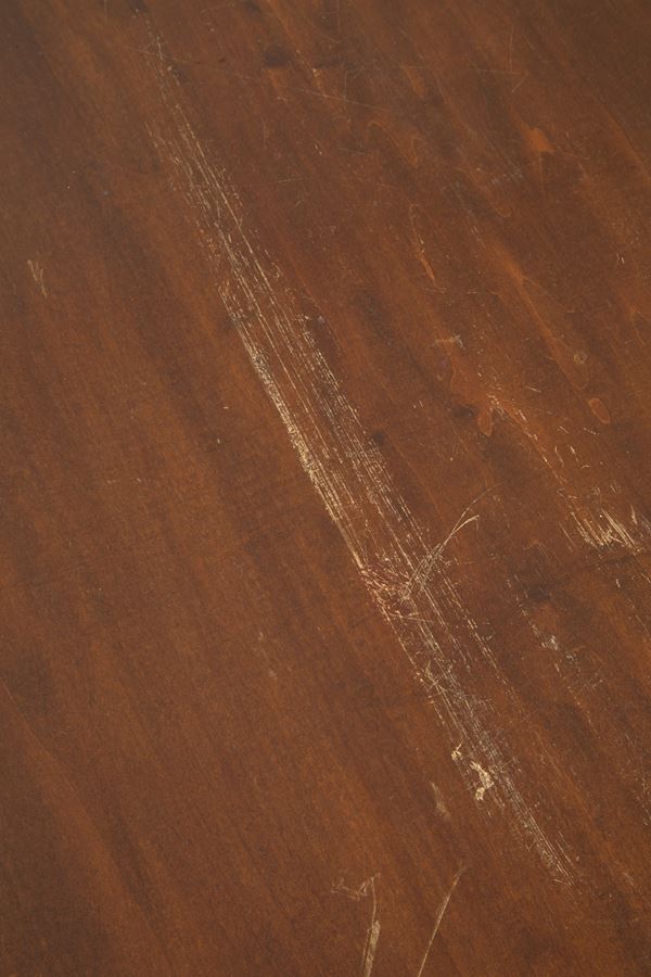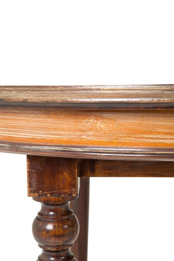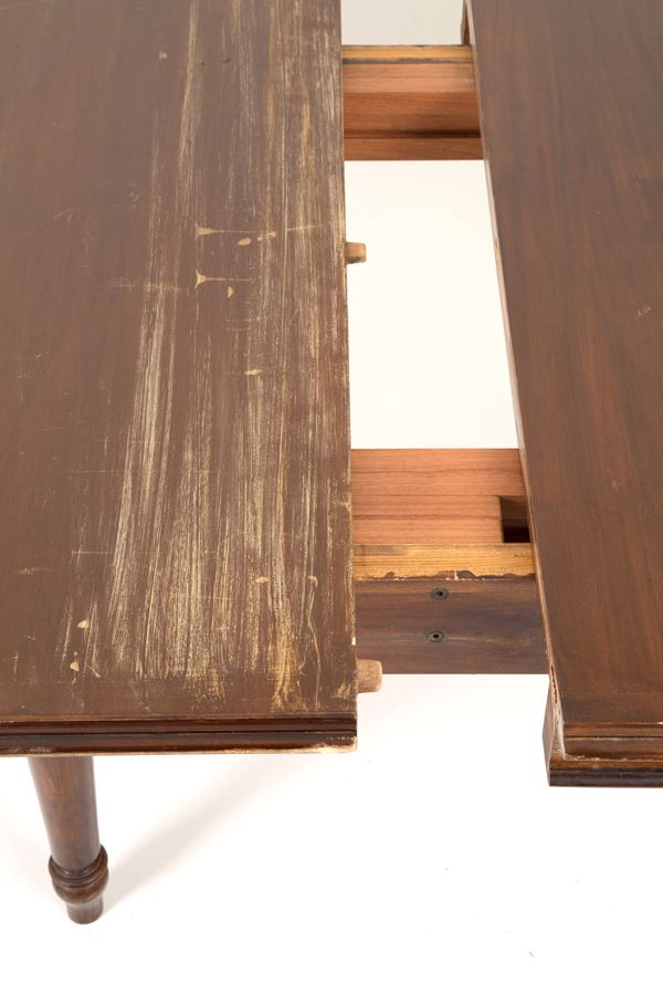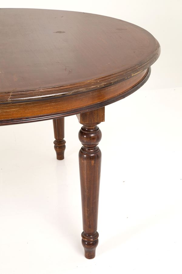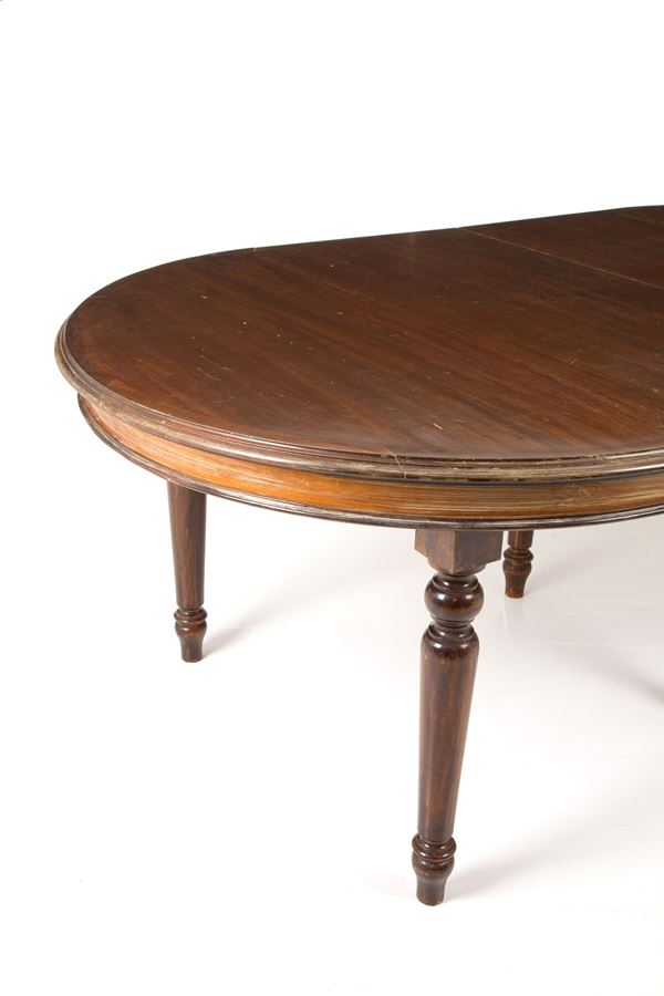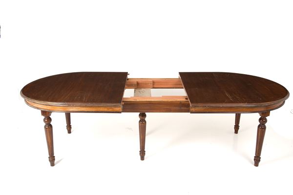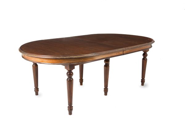 Tavolo ovale allungabile in legno con quattro prolunghe e gambe tornite. XIX secolo. Difetti.