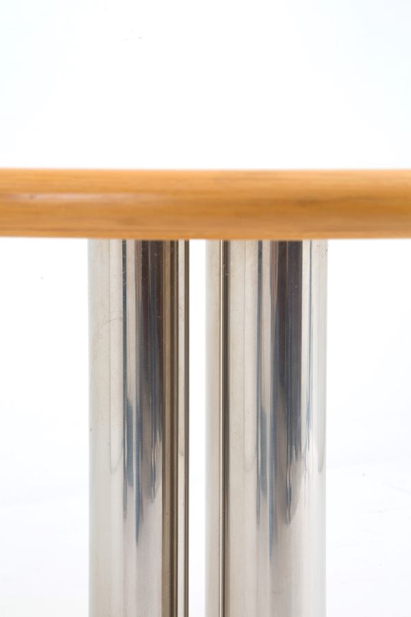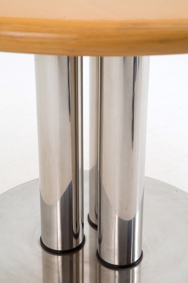 Tavolo con piano in legno e gamba centrale con tre tubi in acciaio.