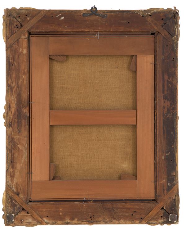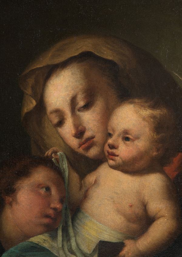Dipinto olio su tela raffigurante "MADONNA CON BAMBINO E SAN GIOVANNINO". In cornice. Restauri. Già rintelato e rintelaiato. Con perizia di attribuzione del prof. Rodolfo Pallucchini.