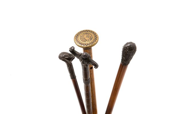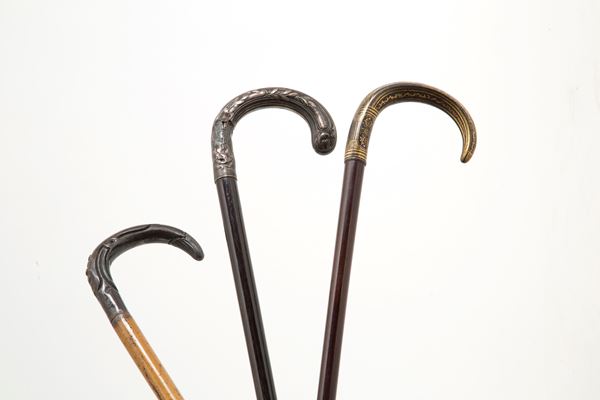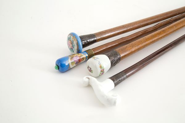 Undici bastoni da passeggio di cui sette con pomello in argento e quattro in porcellana di Sevres. Inizi XIX-XX secolo. Lievi difetti. Misure varie.