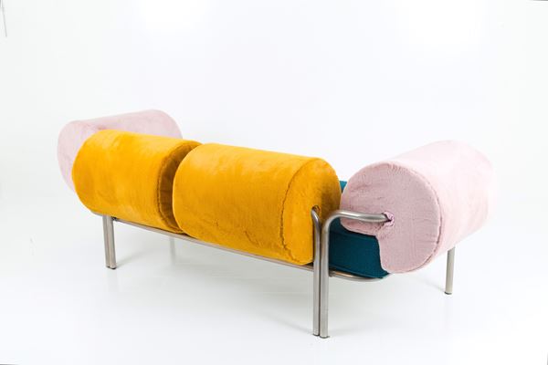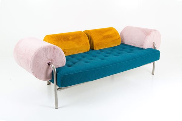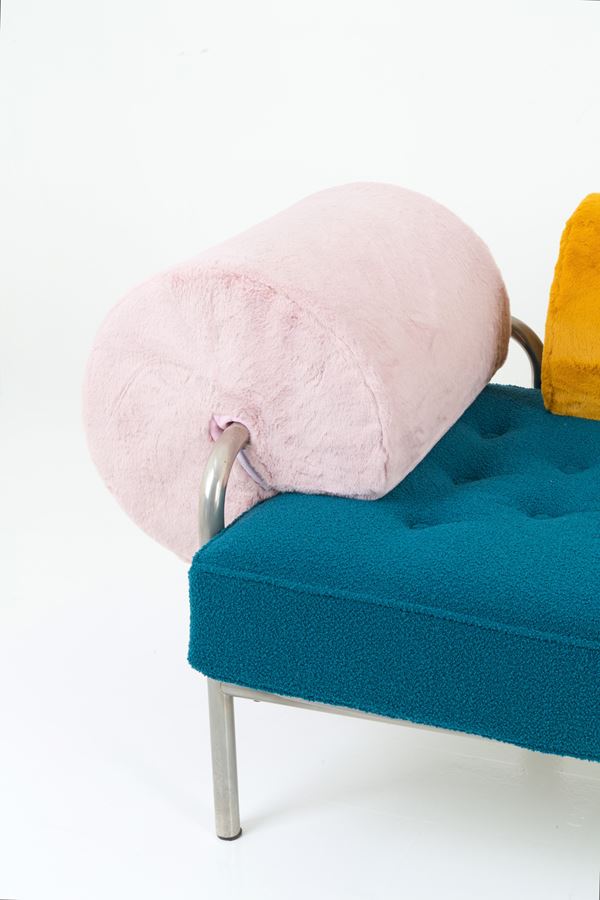 Day bed con struttura in metallo cromato e seduta, schienale e braccioli in tessuto blu, ocra e rosa cipria. Anni '70. Segni di usura del tempo.