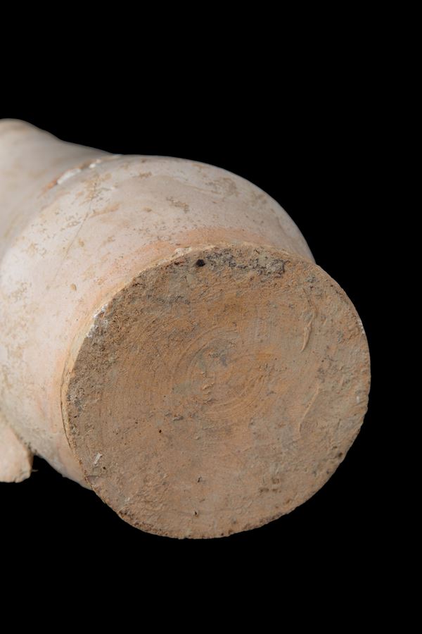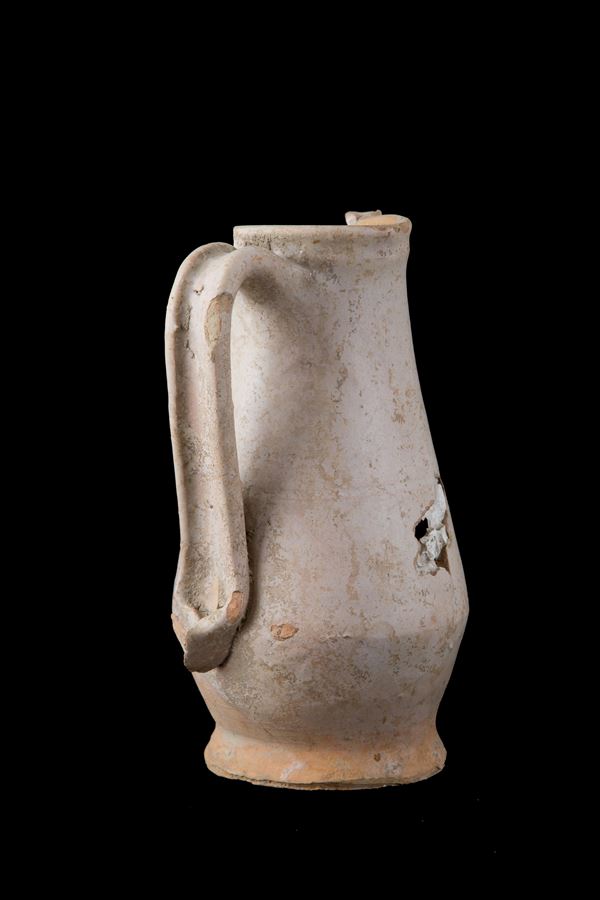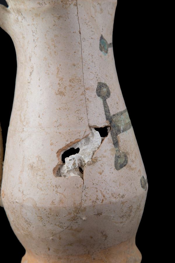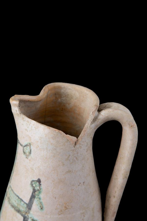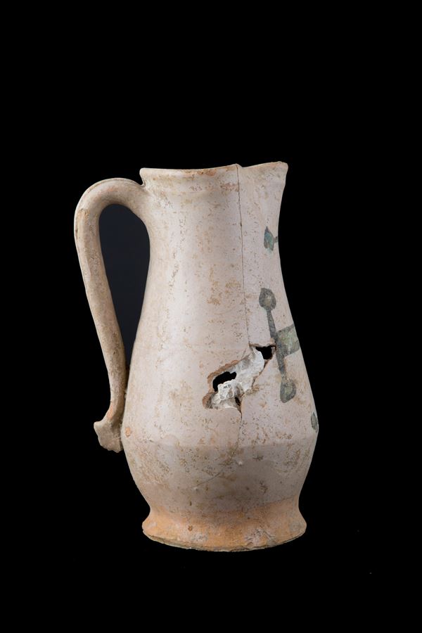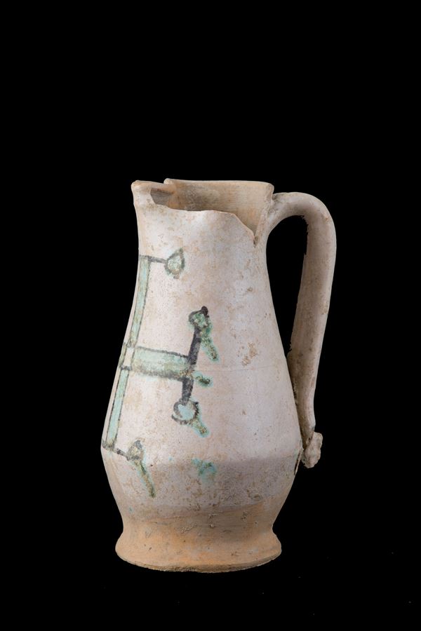 Brocca in maiolica con croce color verde acqua. Italia centrale. XVII secolo. Difetti, rotture e mancanze.