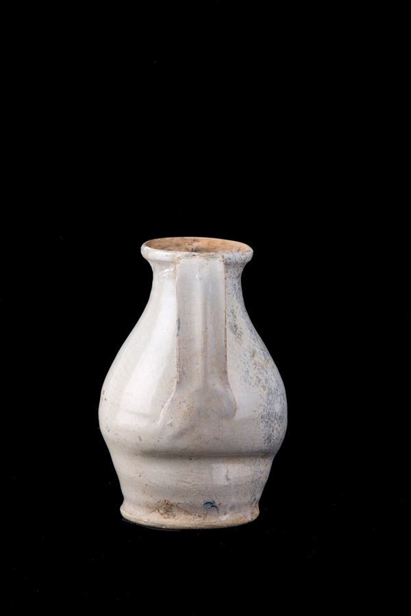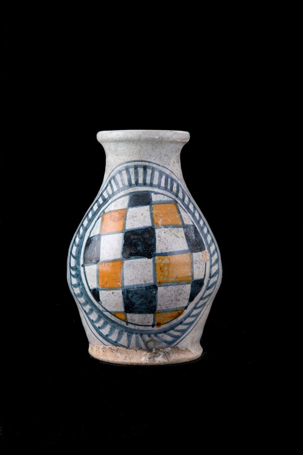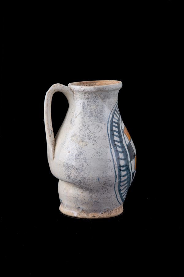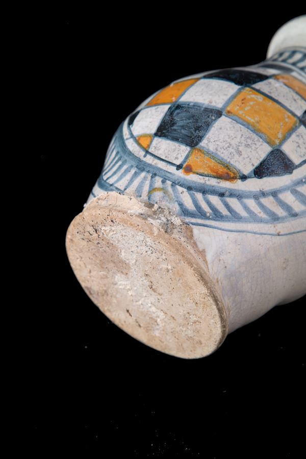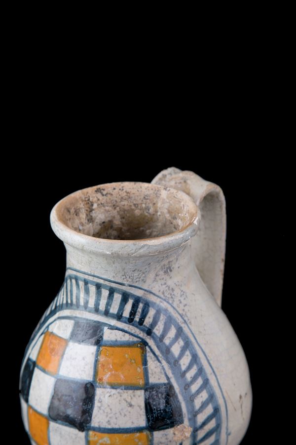 Brocca in maiolica bianca con decoro a scacchiera nei toni del blu e del giallo. Toscana. XVI secolo. Difetti e restauri.