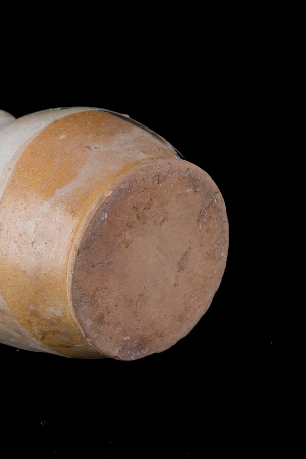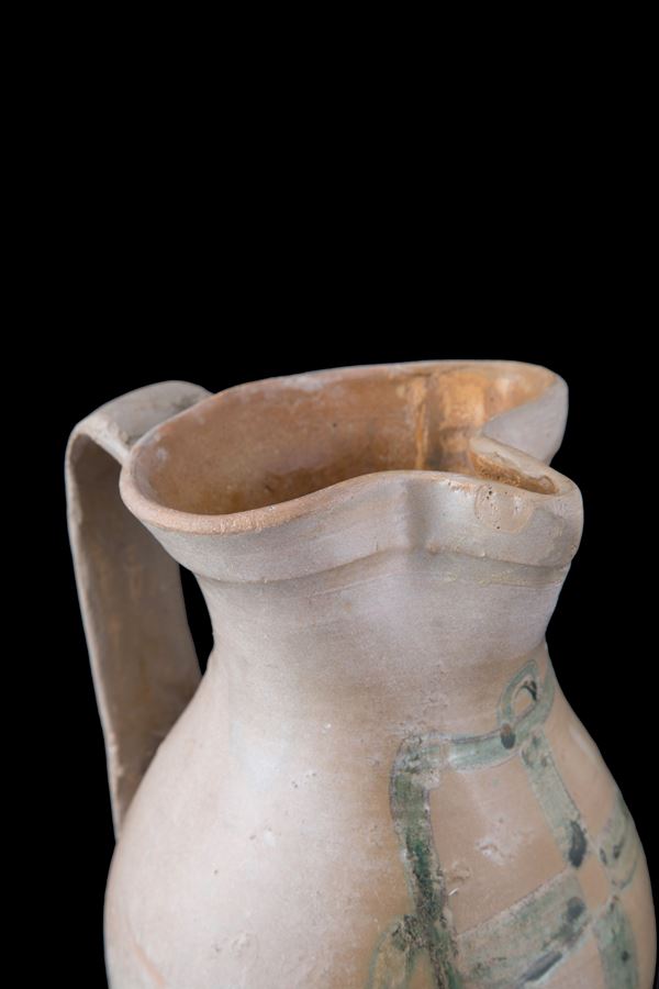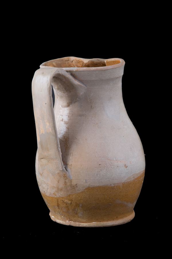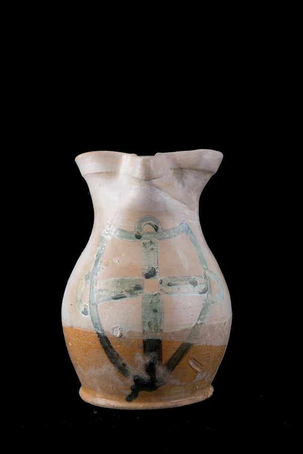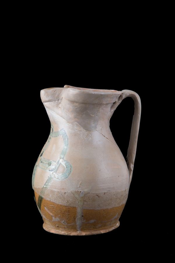 Brocca in maiolica dipinta nei toni del marrone con stemma al centro. Viterbo. XVI secolo. Difetti e rotture.