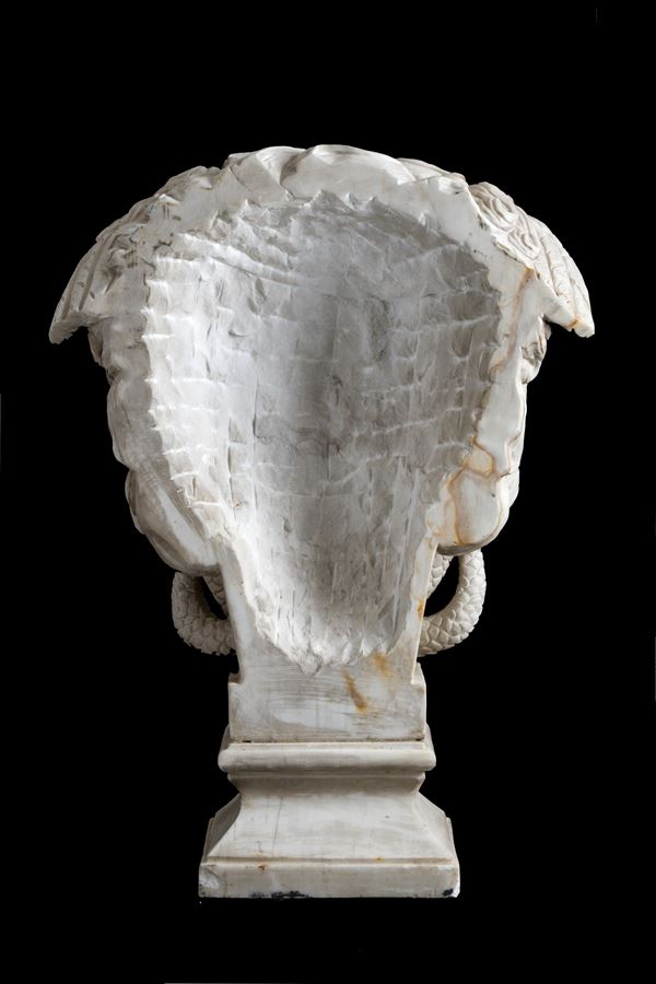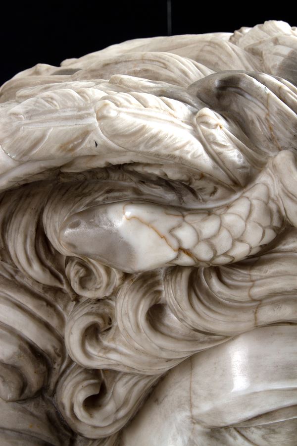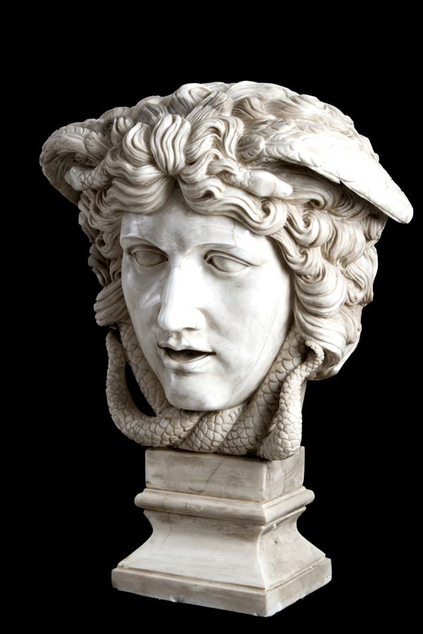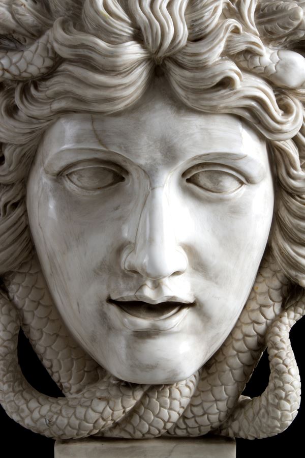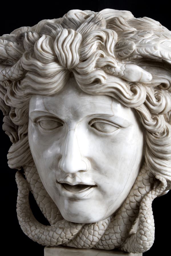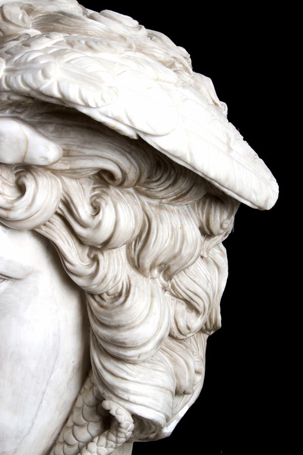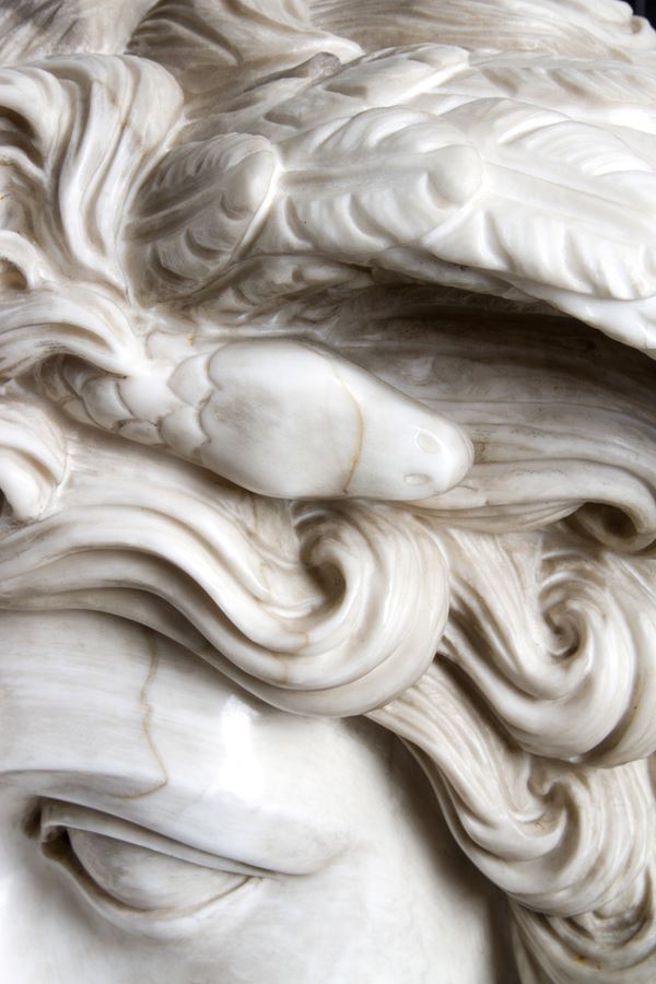 Busto in marmo bianco raffigurante "MEDUSA". Base in marmo. XX secolo. Difetti.