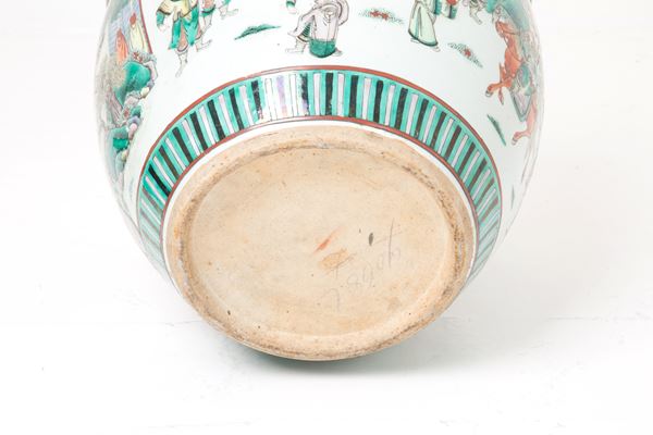 Cachepot in porcellana Famiglia Verde decorato con scene di vita orientale all'esterno e pesci rossi all'interno. Cina. Periodo Guangxu.