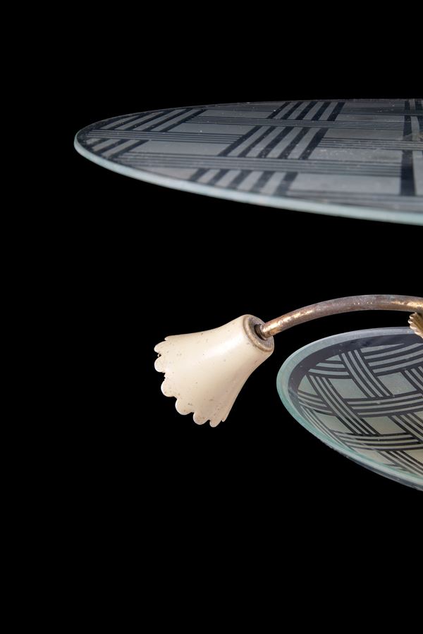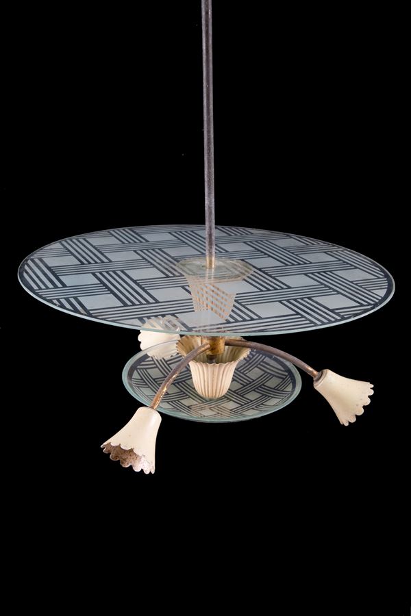 Lampadario tre luci con vetri incisi e supporto in ottone e metallo verniciato. Produzione FONTANA ARTE. Anni '60-'70.
