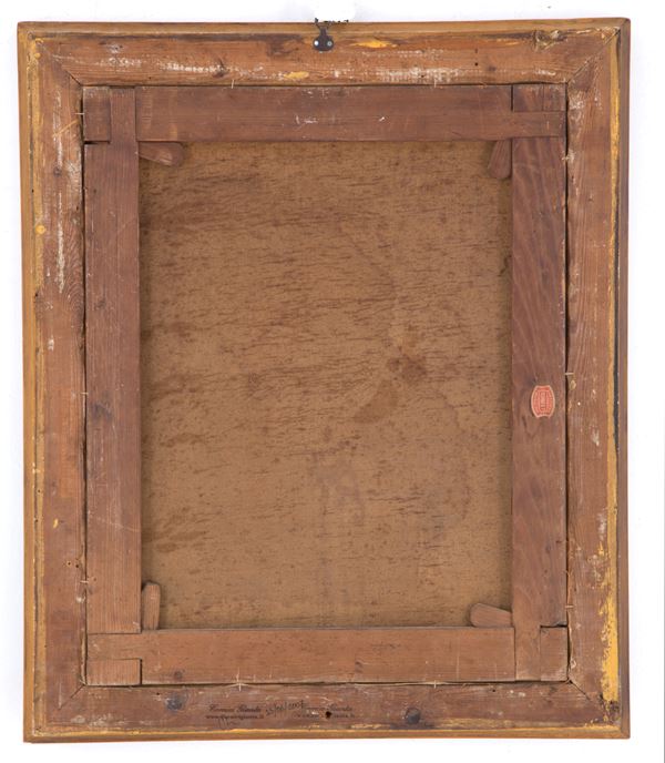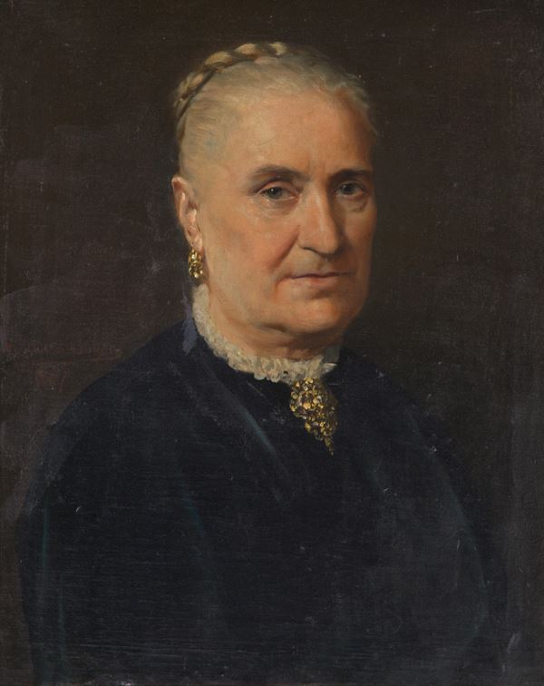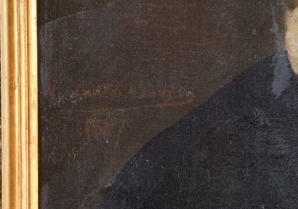 Dipinto olio su tela raffigurante "RITRATTO DI SIGNORA". Firmato e datato 1887 in centro a sinistra. In cornice intagliata e dorata. Difetti.