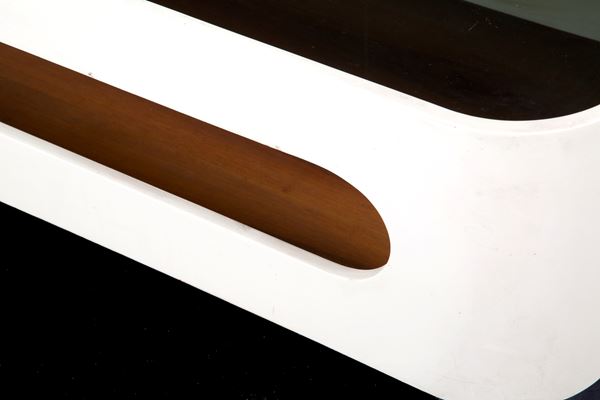 Tavolino da caffè in legno, legno laccato e piano in vetro. Anni '70. Difetti e segni di usura del tempo.