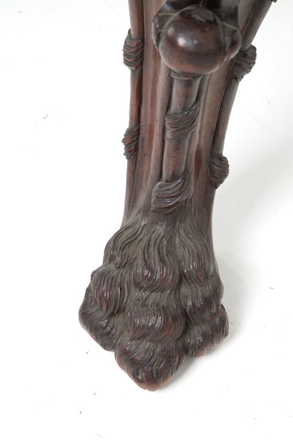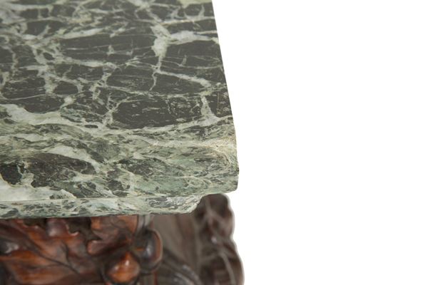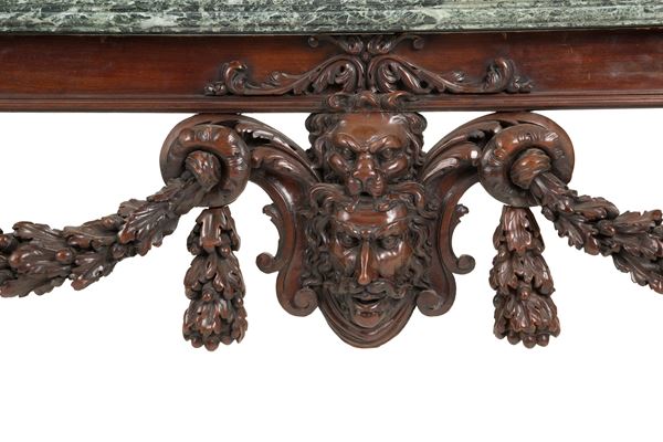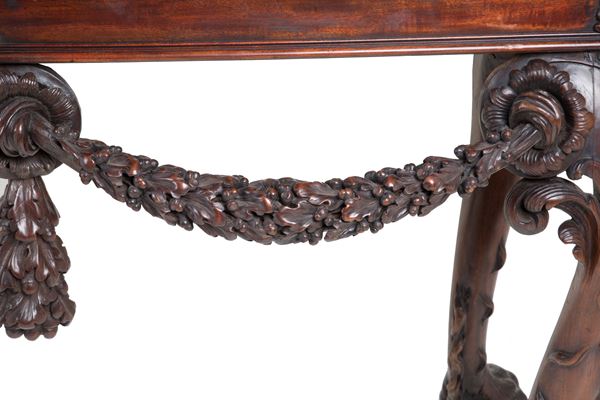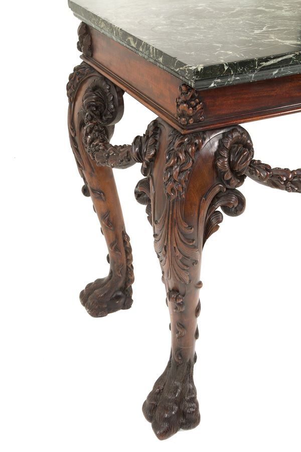 Coppia di imponenti consolle in mogano finemente intagliato con motivi a ghirlande, mascheroni e piedi caprini con piani in marmo verde Alpi. Inghilterra-Irlanda. XVIII secolo. Difetti.