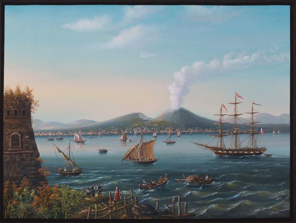 Coppia di gouache su carta raffiguranti ''PAESAGGIO CON BARCHE E VESUVIO'' e ''NAPOLI VISTA DAL MARE CON BARCHE E PERSONAGGI''. XX secolo.