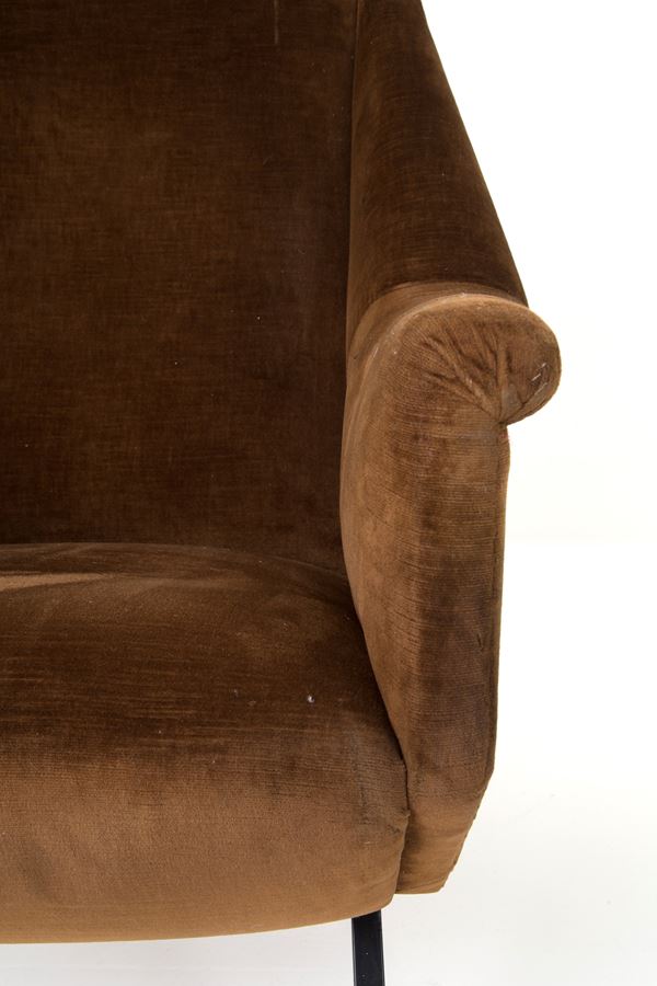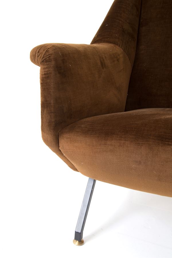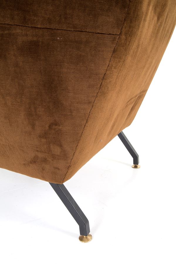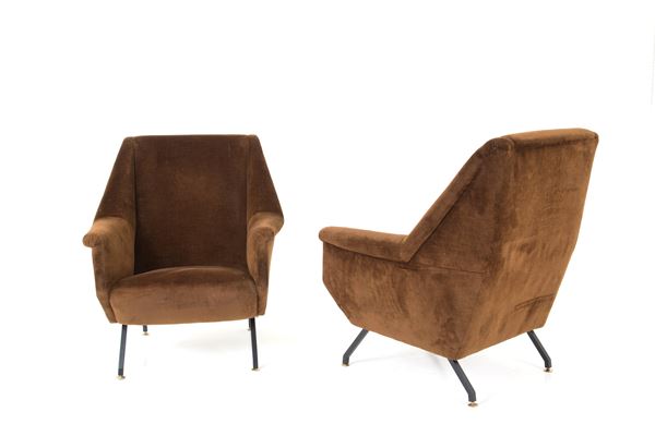 Coppia di poltrone in velluto marrone con piedi in metallo verniciato nero e ottone. Anni '60. Segni di usura del tempo.