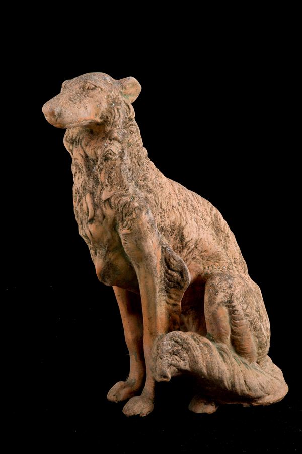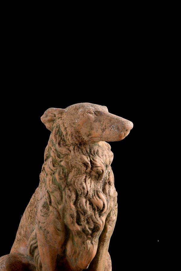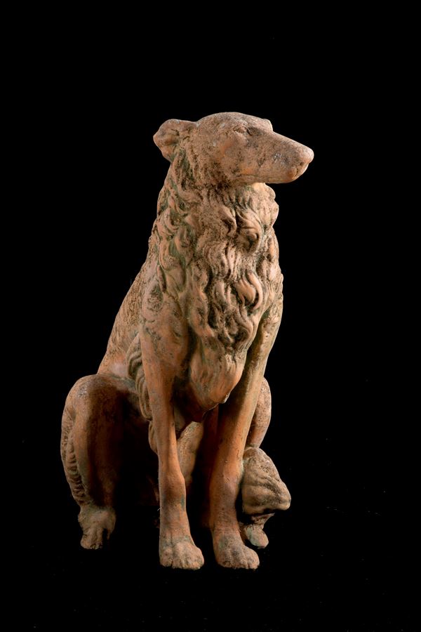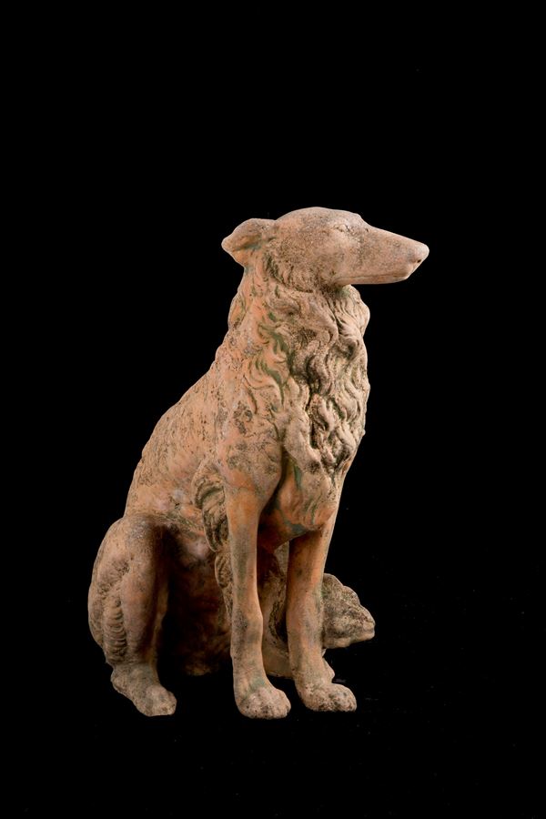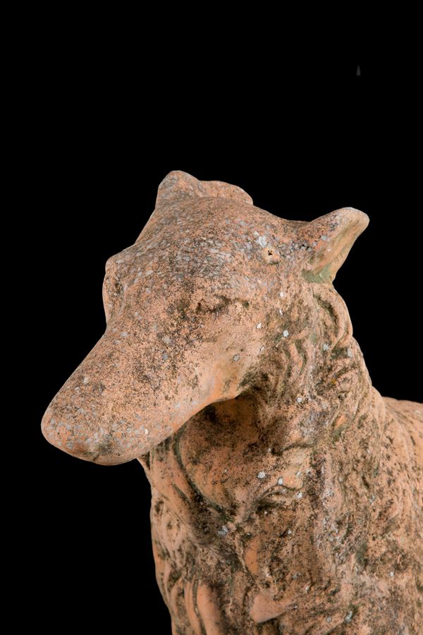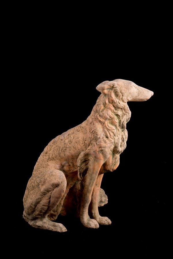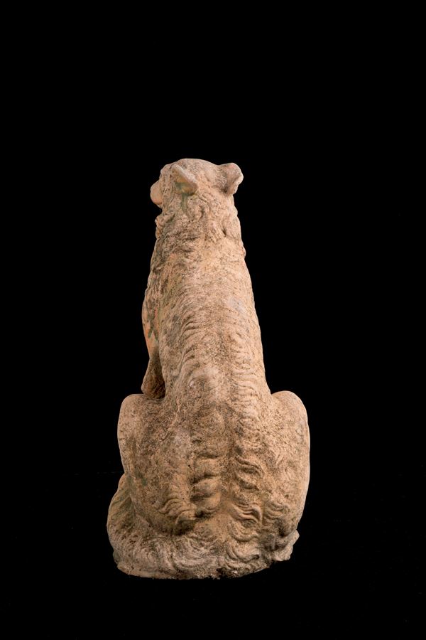 Coppia di sculture in agglomerato di pietra raffiguranti "CANI". XX secolo. Segni di usura del tempo.