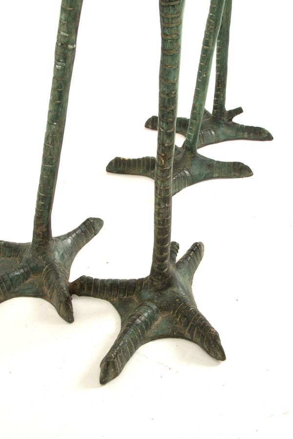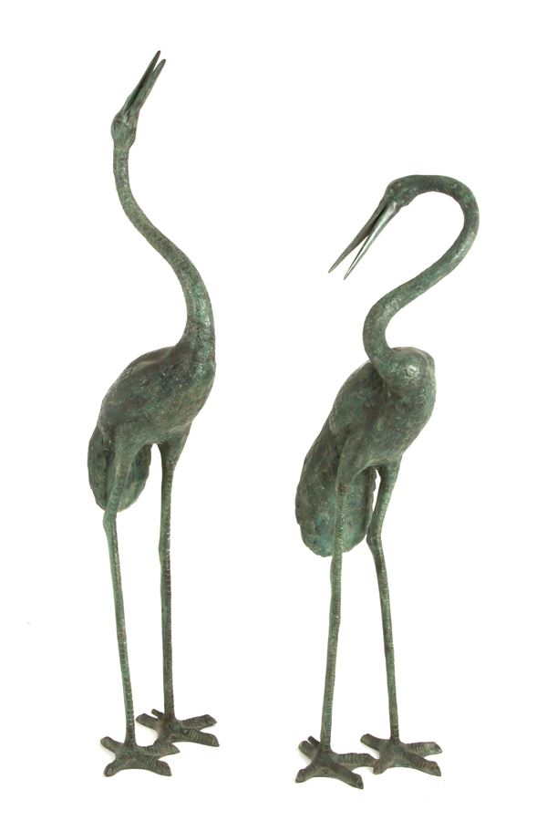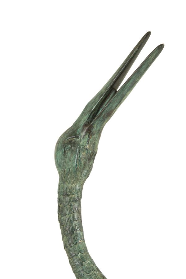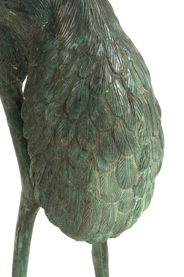 Coppia di sculture da fontana in bronzo dipinto verde raffiguranti "AIRONI". Con meccanismo per zampillo d'acqua. XX secolo. Segni di usura del tempo.
