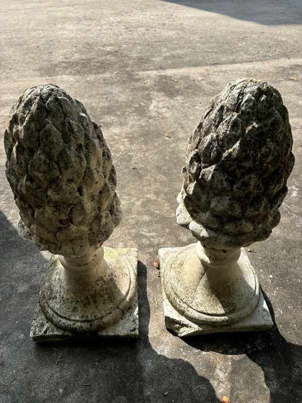 Coppia di sculture in agglomerato di pietra raffiguranti "PIGNE".