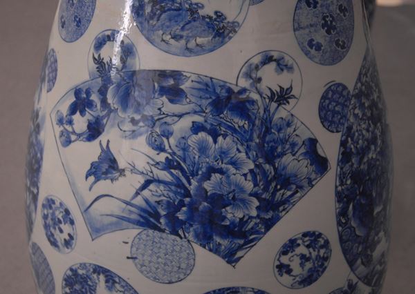 Coppia di vasi in porcellana bianca e blu. Basi in legno. Giappone. XIX secolo. Mis. Alt. cm. 155 e 167 ca. Diam. cm. 48 ca.