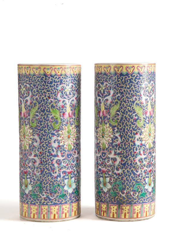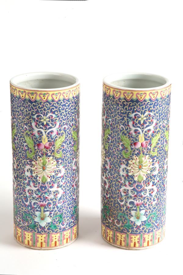 Coppia di vasi cilindrici in porcellana Famiglia Rosa. Cina.