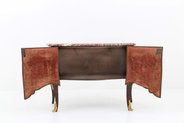 Credenza in legno lastronato in bois de violette e bois de rose con finiture in bronzo finemente cesellato e dorato e piano in marmo rosso. Francia. XVIII secolo.