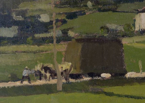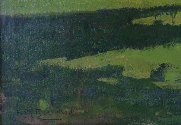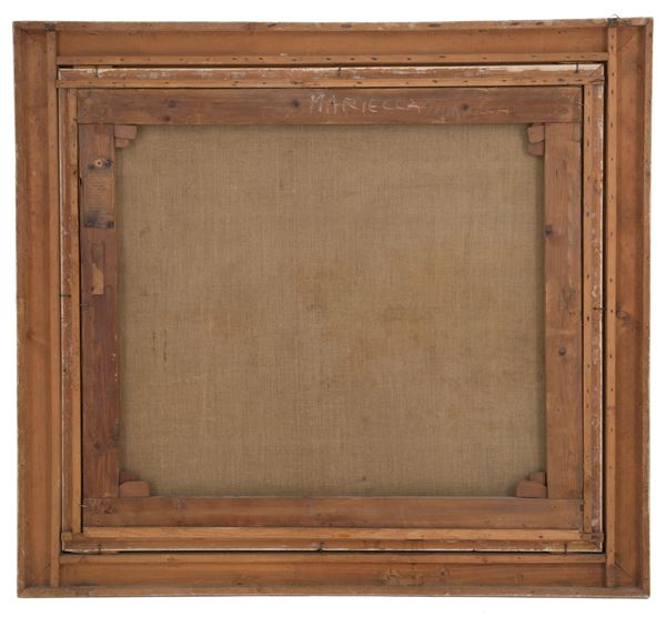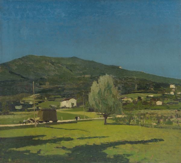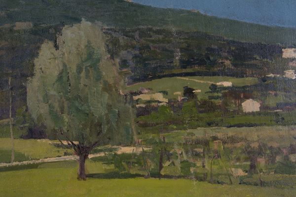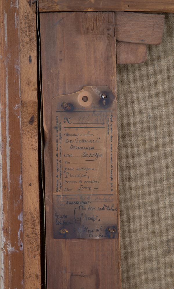 Dipinto olio su tela intitolato "PREALPI". Firmato e datato in basso a sinistra. In cornice intagliata e laccata. Con cartiglio sul retro.