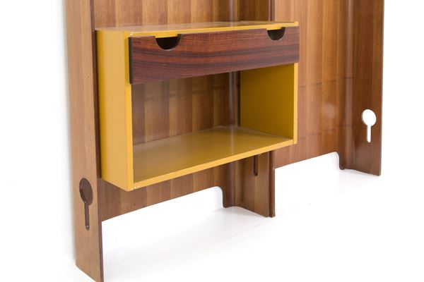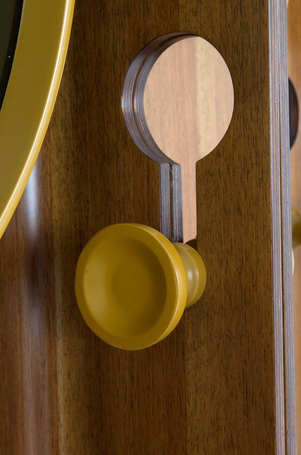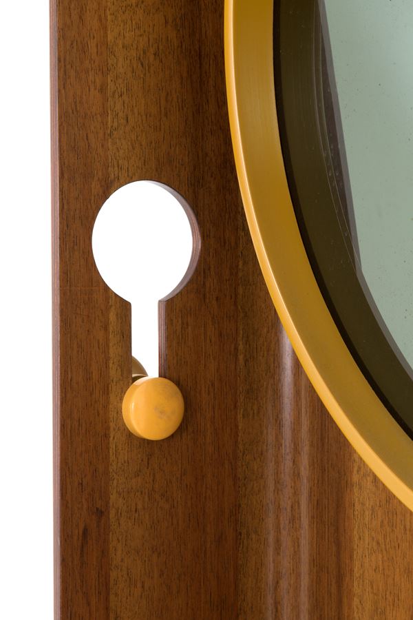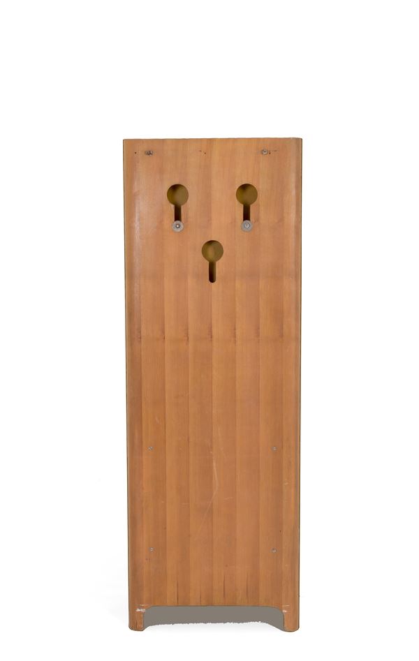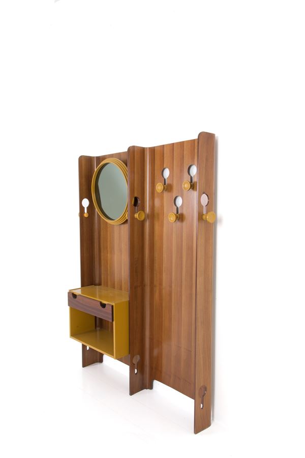 Set da ingresso in teak curvato e legno laccato composto da un elemento con cassettiera e specchio e un appendiabiti. Produzione FIARM, Scorzè-Venezia (Attr.). Anni '60. Difetti e segni di usura del tempo.