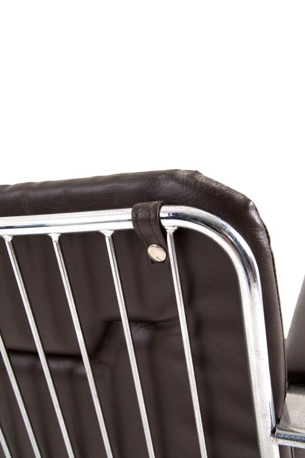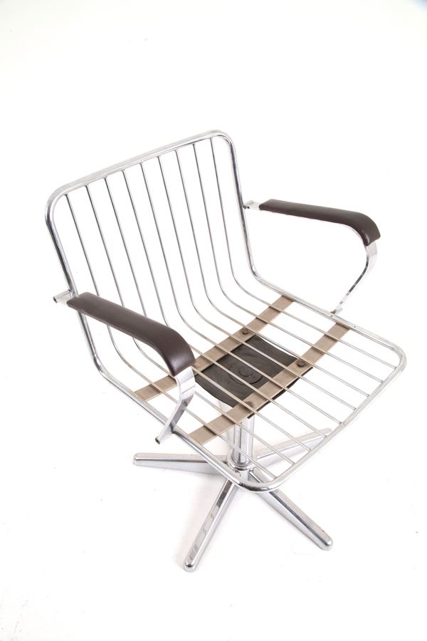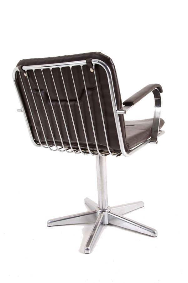 Sei poltrone da ufficio Delta 2000 in acciaio a cinque razze con cuscini removibili e braccioli rivestiti in pelle marrone. Produzione WILKHAHN (Attr.). Anni '70. Difetti e segni di usura del tempo.