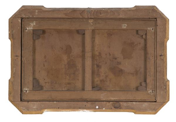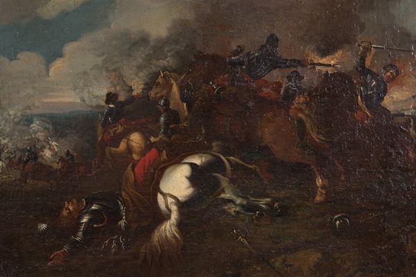 Dipinto olio su tela raffigurante "BATTAGLIA". XVIII secolo. In cornice dorata.