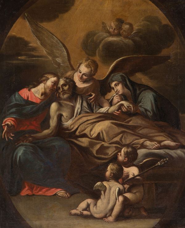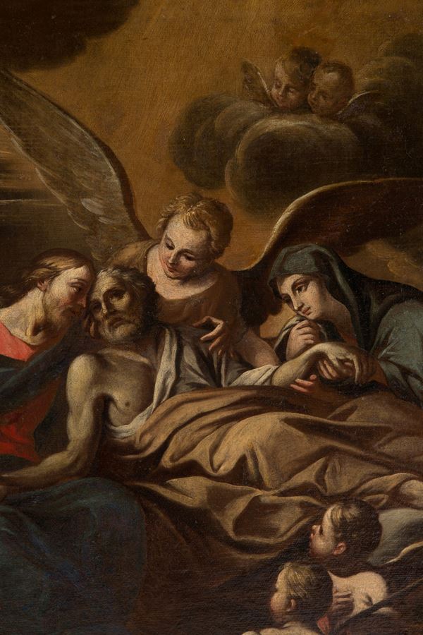 Dipinto olio su tela raffigurante "ESTASI DI SAN GIUSEPPE". XVII secolo. In cornice. Vecchi restauri. Già rintelato e rintelaiato.
