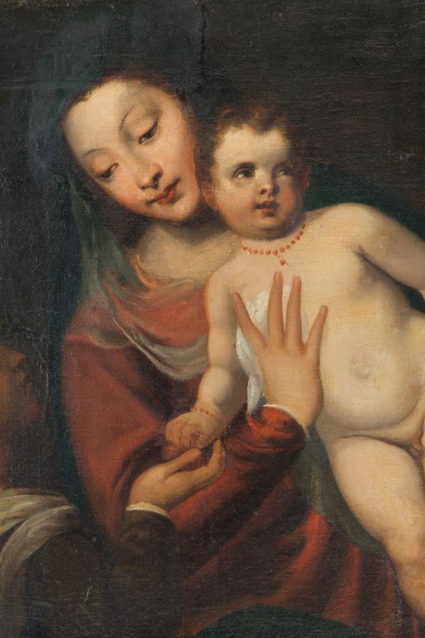 Dipinto olio su tela raffigurante "MADONNA CON BAMBINO". Fine XVII secolo. Difetti e restauri.