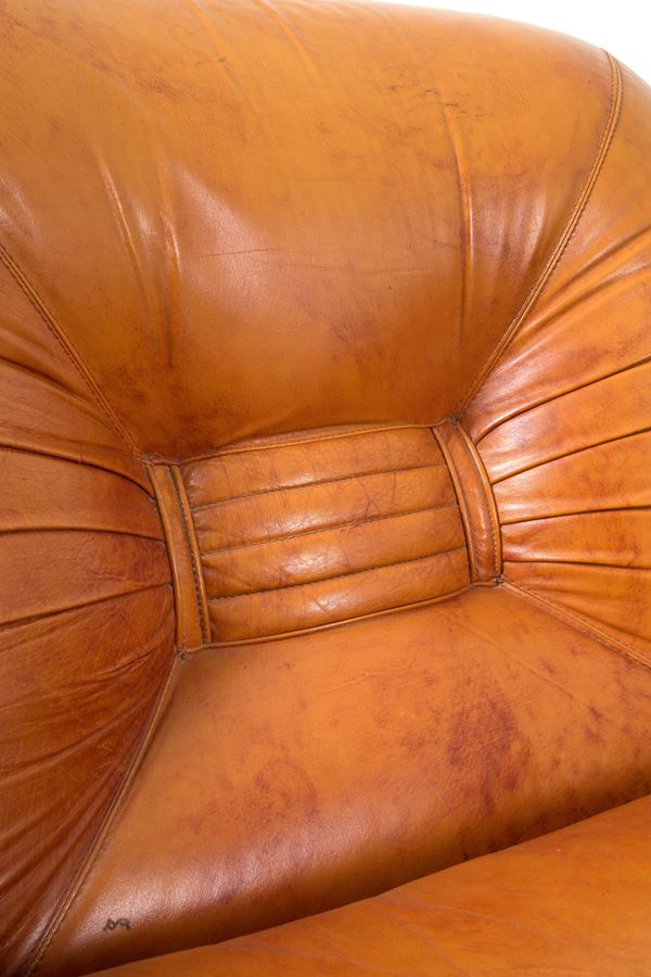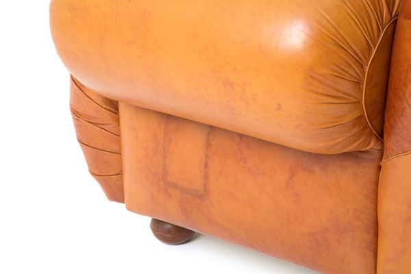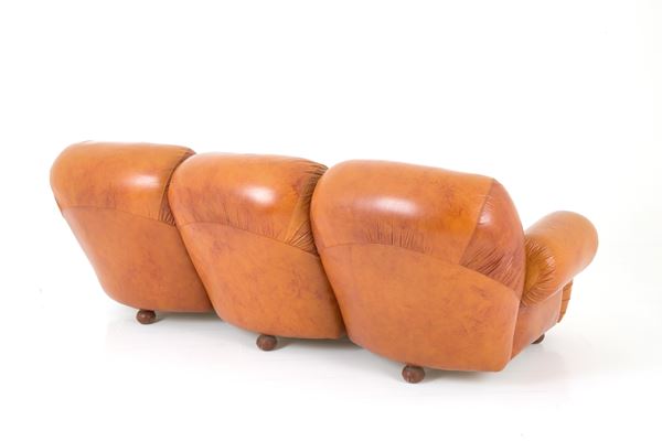 Divano tre posti in pelle marrone. Anni '70. Segni di usura del tempo.