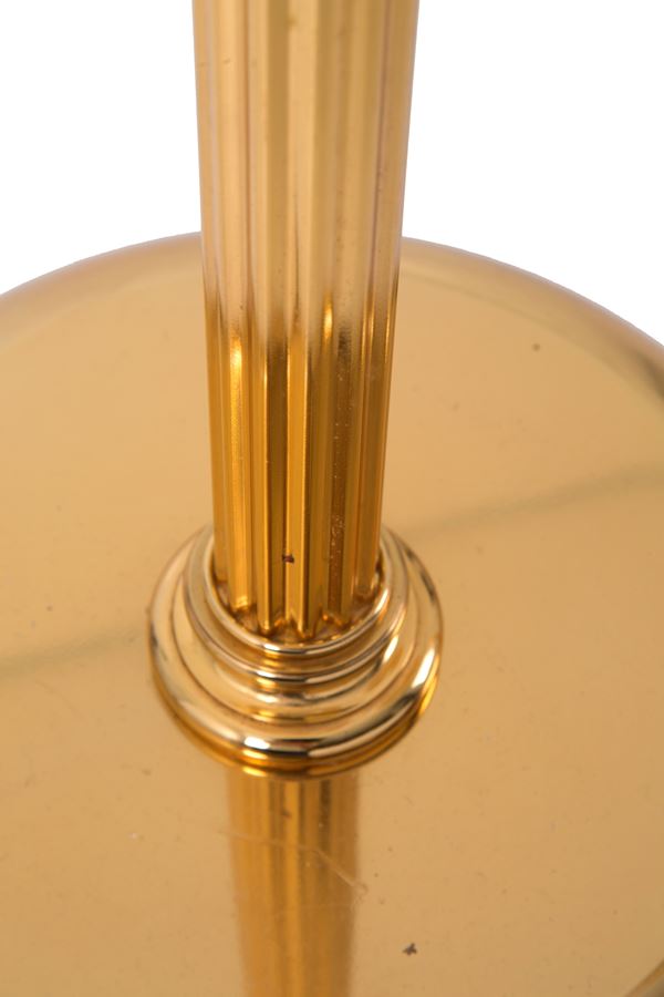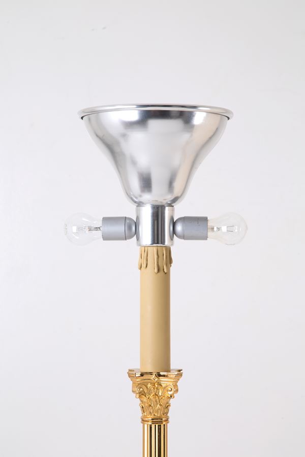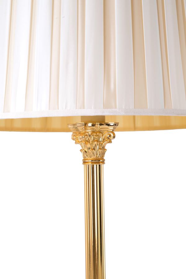 Due piantane in ottone a forma di colonne con capitello corinzio e paralumi in seta bianca. XX secolo.