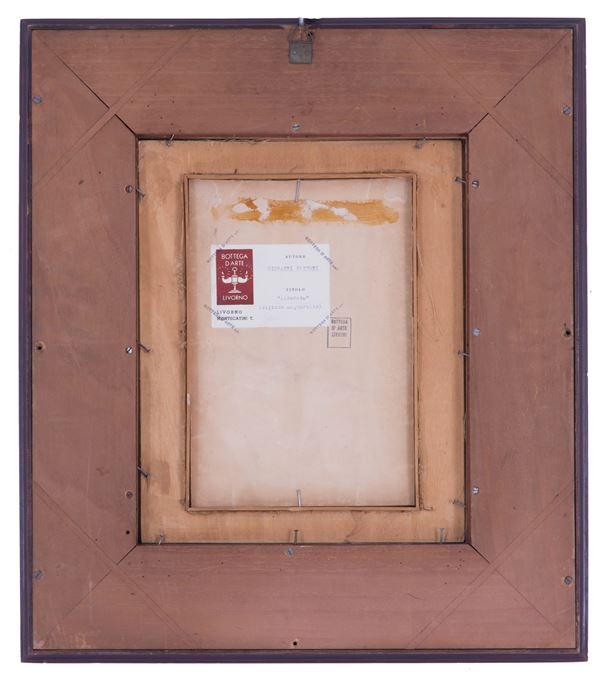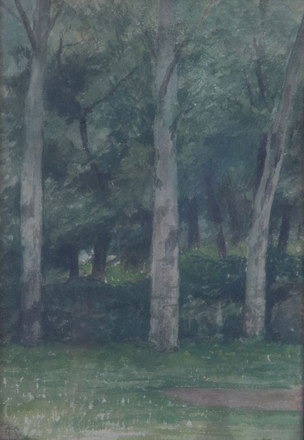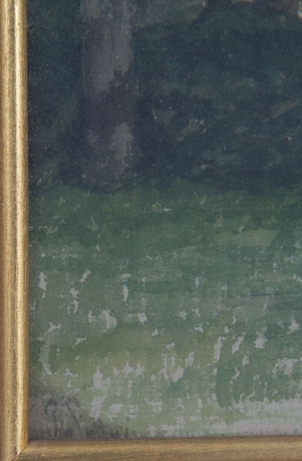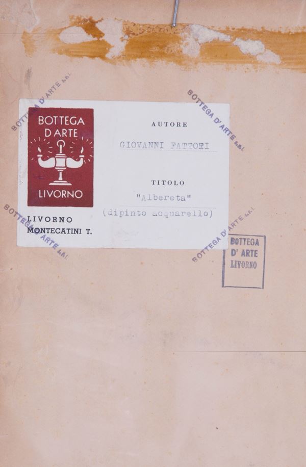 Acquarello su cartoncino intitolato "ALBERETA". Firmato in basso a sinistra. In cornice. Con cartiglio della Bottega d'Arte di Livorno sul retro. Difetti.