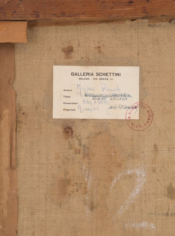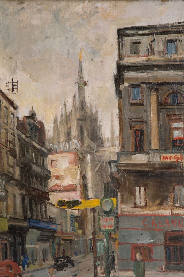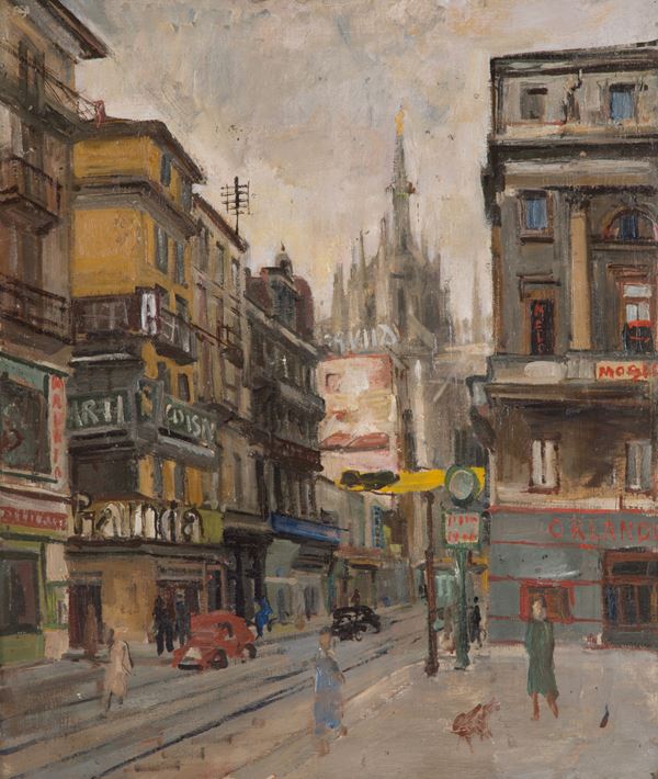 Dipinto olio su tela raffigurante "MILANO, CORSO VITTORIO EMANUELE". In cornice. Con cartiglio della Galleria Schettini, via Brera 14 Milano sul retro.
