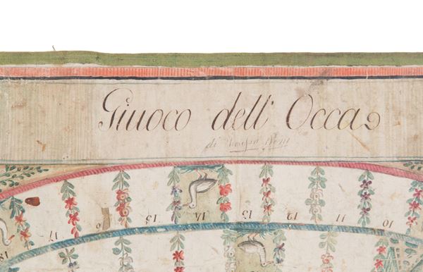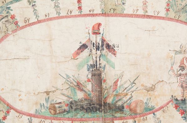 Gioco dell'oca dipinto a tempera su carta applicata su tela. XIX secolo. In cornice. Difetti.