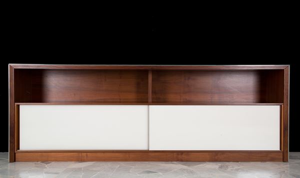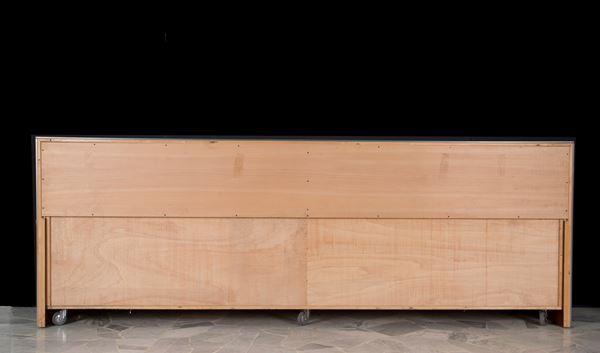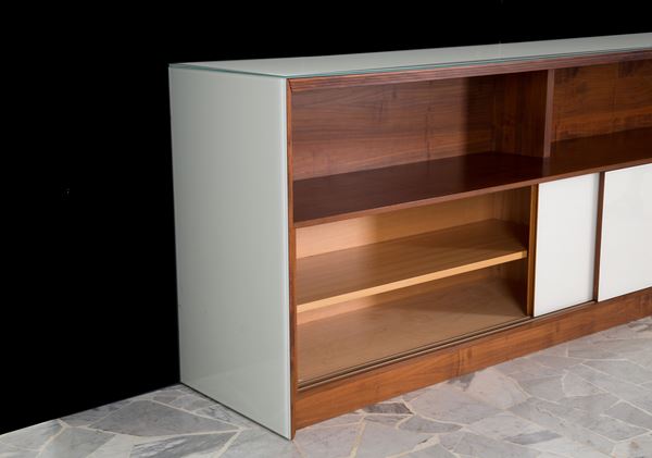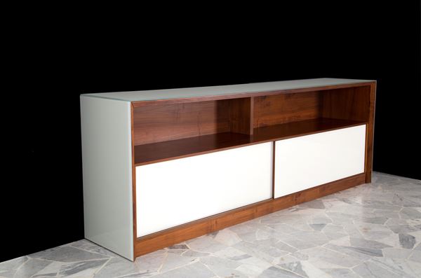 Grande credenza in legno parzialmente rivestita in vetro lattimo con due ante scorrevoli e rotelle. Manifattura italiana. Anni '70-'80. Lievissimi segni d'usura.