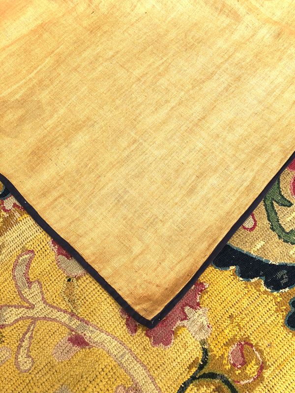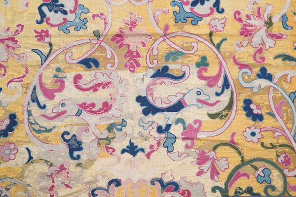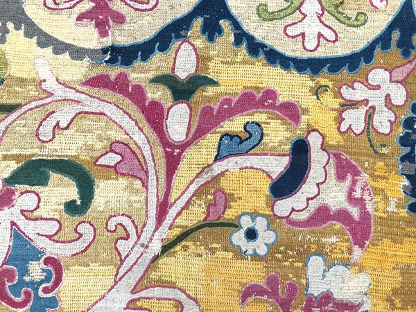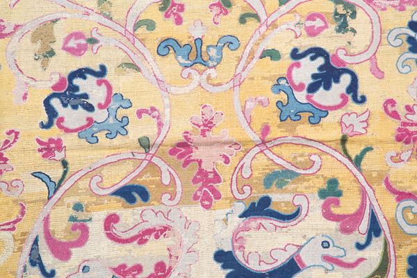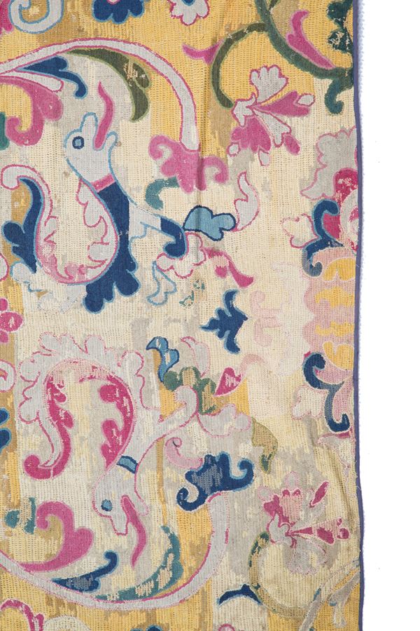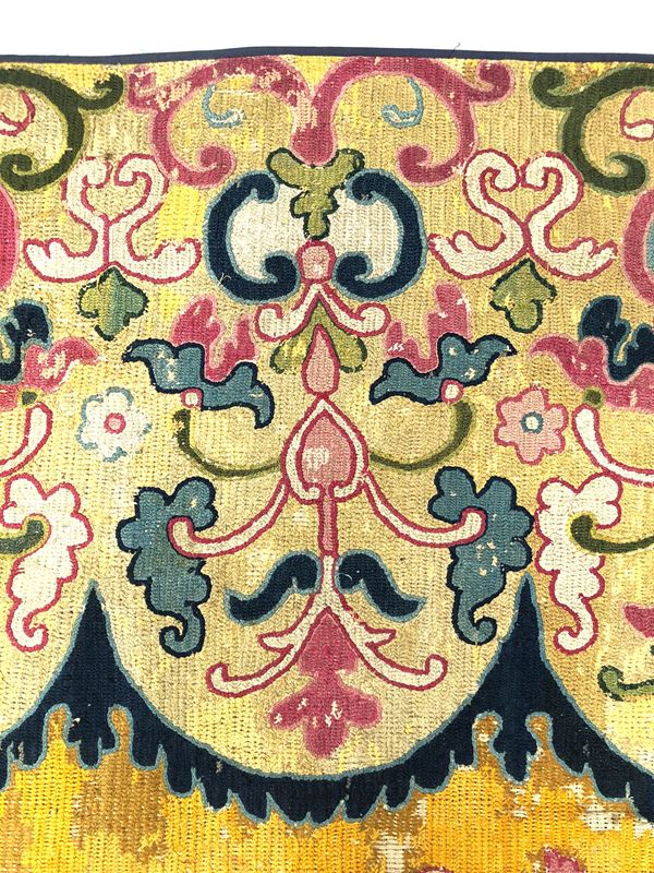 Grande frammanto di tappeto Arrajolos tessuto a mano. Portogallo. Metà XVII. Vari piccoli interventi sul campo, già lavato e foderato.