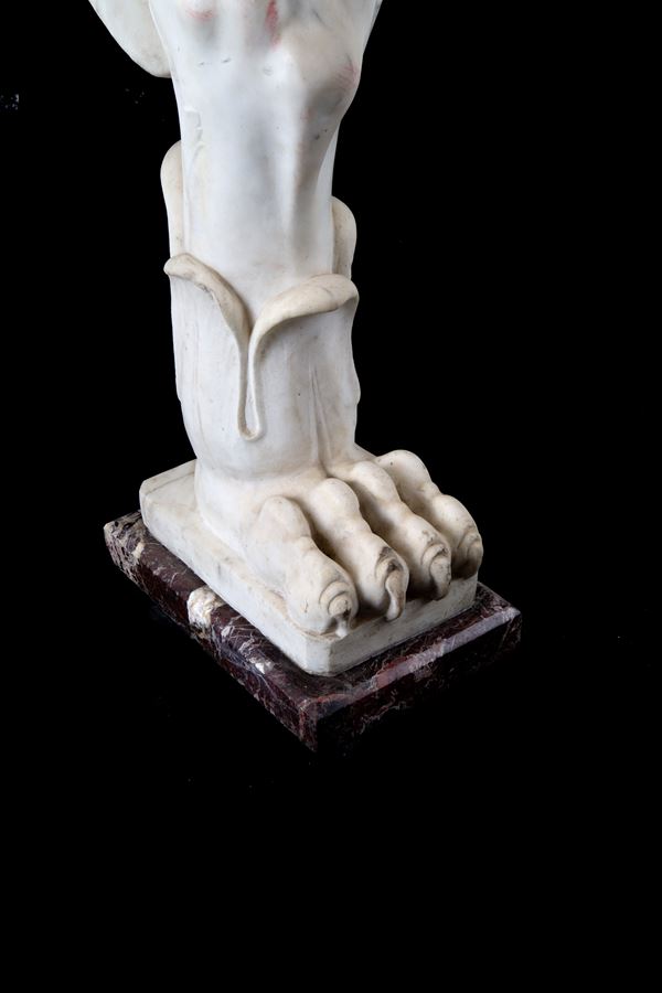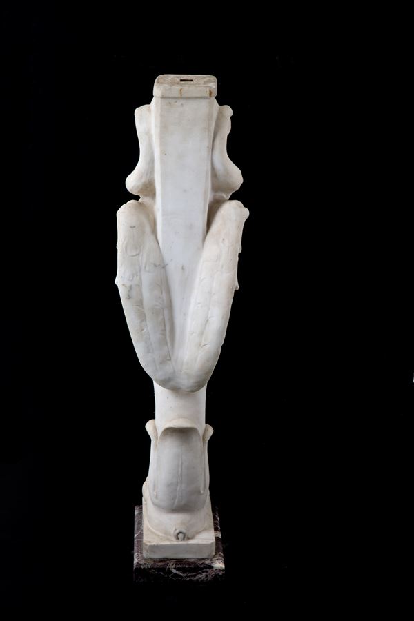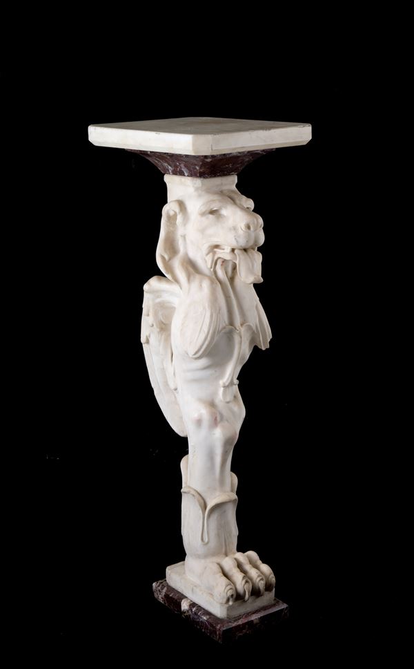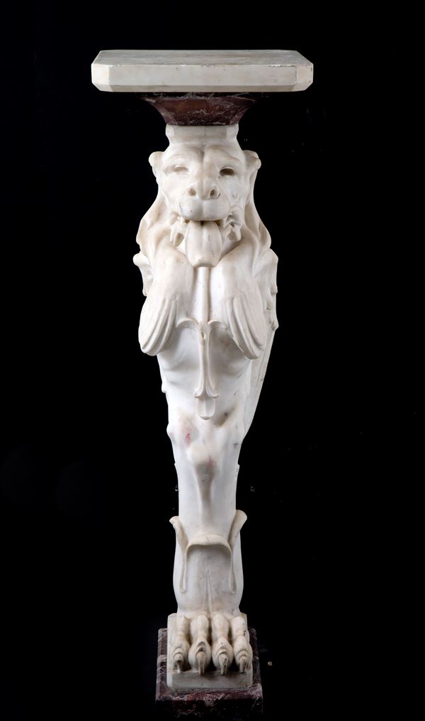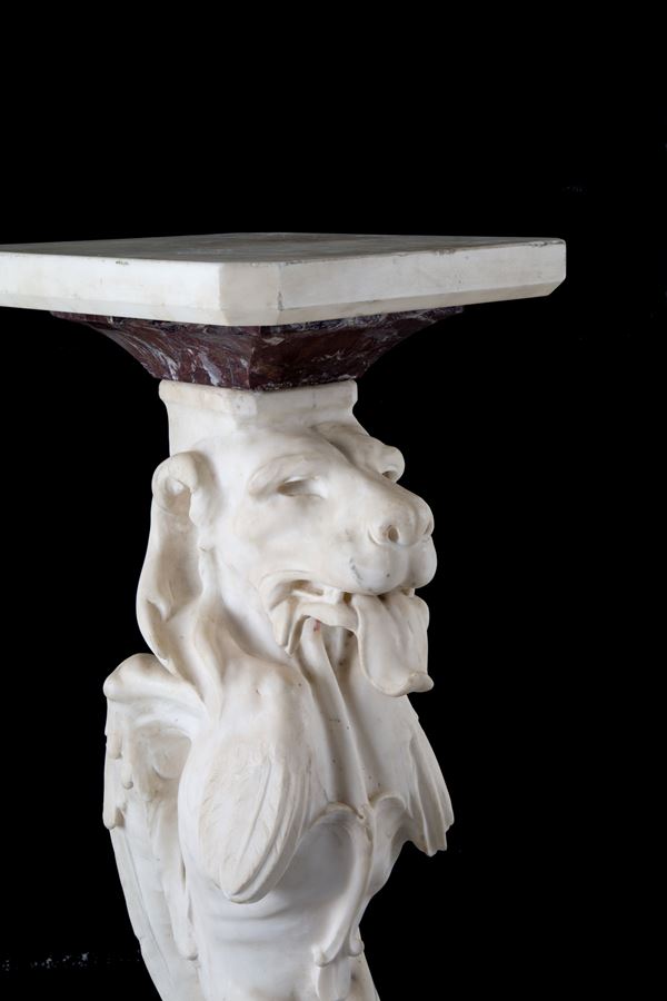 Gueridon a guisa di leone in marmo bianco di Carrara e rosso brecciato. Genova. XVIII secolo.