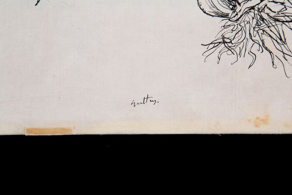Disegno a china su carta applicata su tela raffigurante "AGLI". Firmato in basso al centro. In cornice. Difetti.
