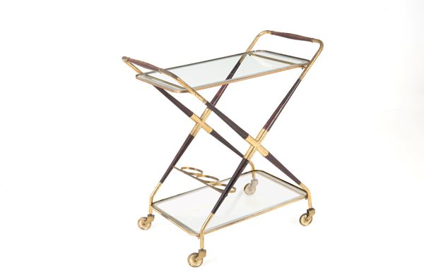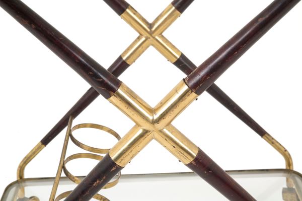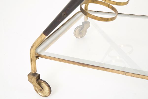 Carrello bar in legno, ottone e ripiani in vetro. Anni '50. Difetti e rotture.
